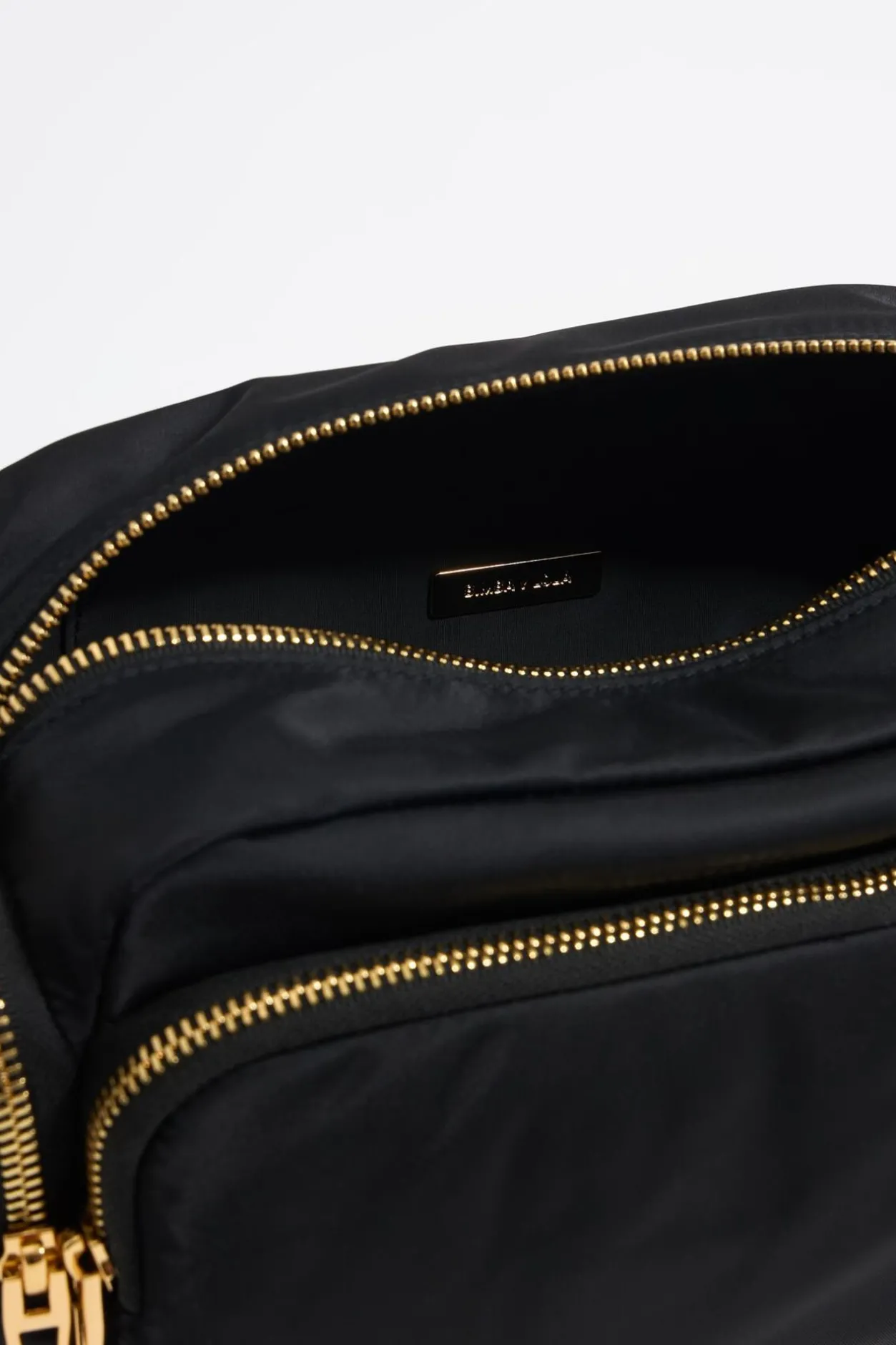 Bolso Bandolera De Nylon Con Multibolsillos En Color Negro. Modelo De TamaÑO Mediano, Cierre De Cremallera, Asa Larga De Tejido, Bolsillo Interior Y Piezas De Piel. Exterior Personalizado Con Logo MetÁLico. Este Modelo Contiene 100% PoliÉSter Reciclado.