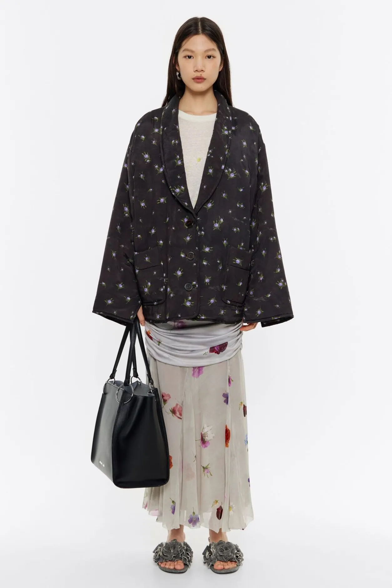 Falda Midi De Lyocell Seda Con Print Flowers En Color Gris. Modelo De Corte Ajustado, Capa Superior Fruncida En Los Laterales Y Capa Inferior Con Vuelo.