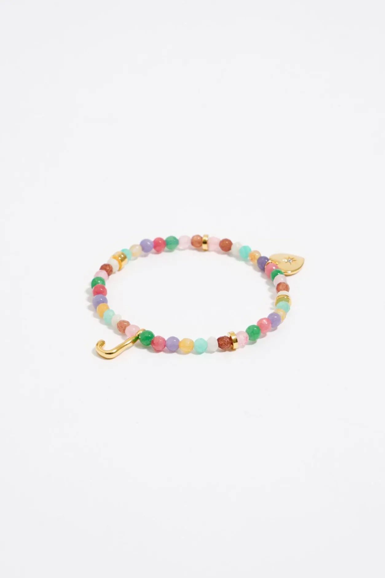 Pulsera ElÁStica De Piedras Multicolores Con Letra J De Metal Dorado. Modelo Con Pieza En Forma De CorazÓN De Metal Dorado Con Cristal.