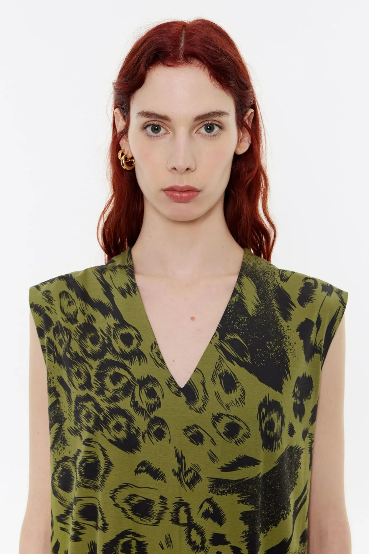 Vestido Midi De AlgodÓN Con Print Animal Mix En Color Verde. Modelo De Corte Recto, Escote En V, Manga Sisa Y Abertura En Pico En La Espalda.