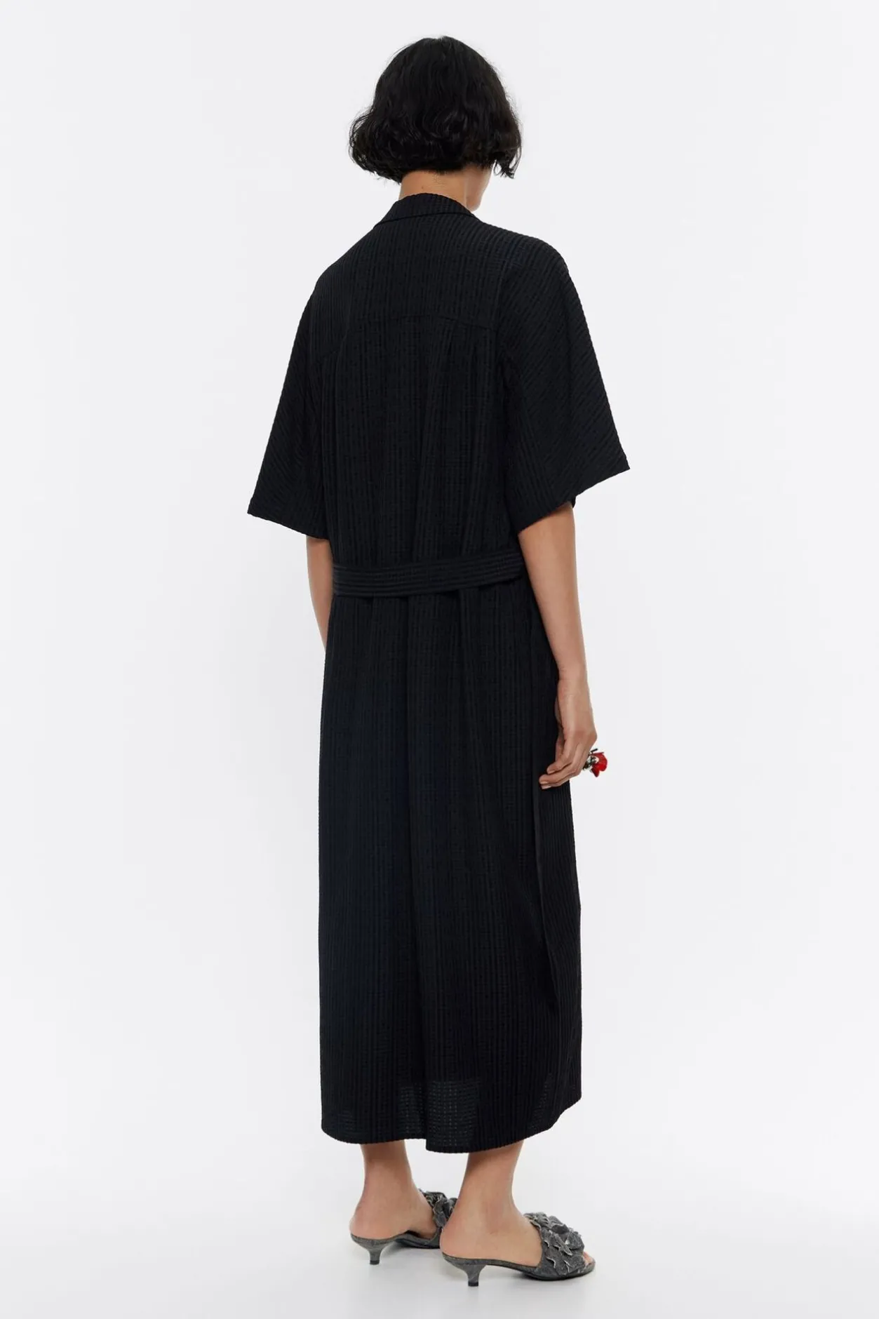 Vestido Largo De Viscosa Con Textura En Color Negro. Modelo De Corte Recto, Con Cuello Camisero Con Solapas, Manga Corta Y Cierre Frontal De Botonadura. Bolsillos PlastrÓN En El Pecho, Bolsillos Con Tapeta En Bajo Delantero Y CinturÓN De Tejido.