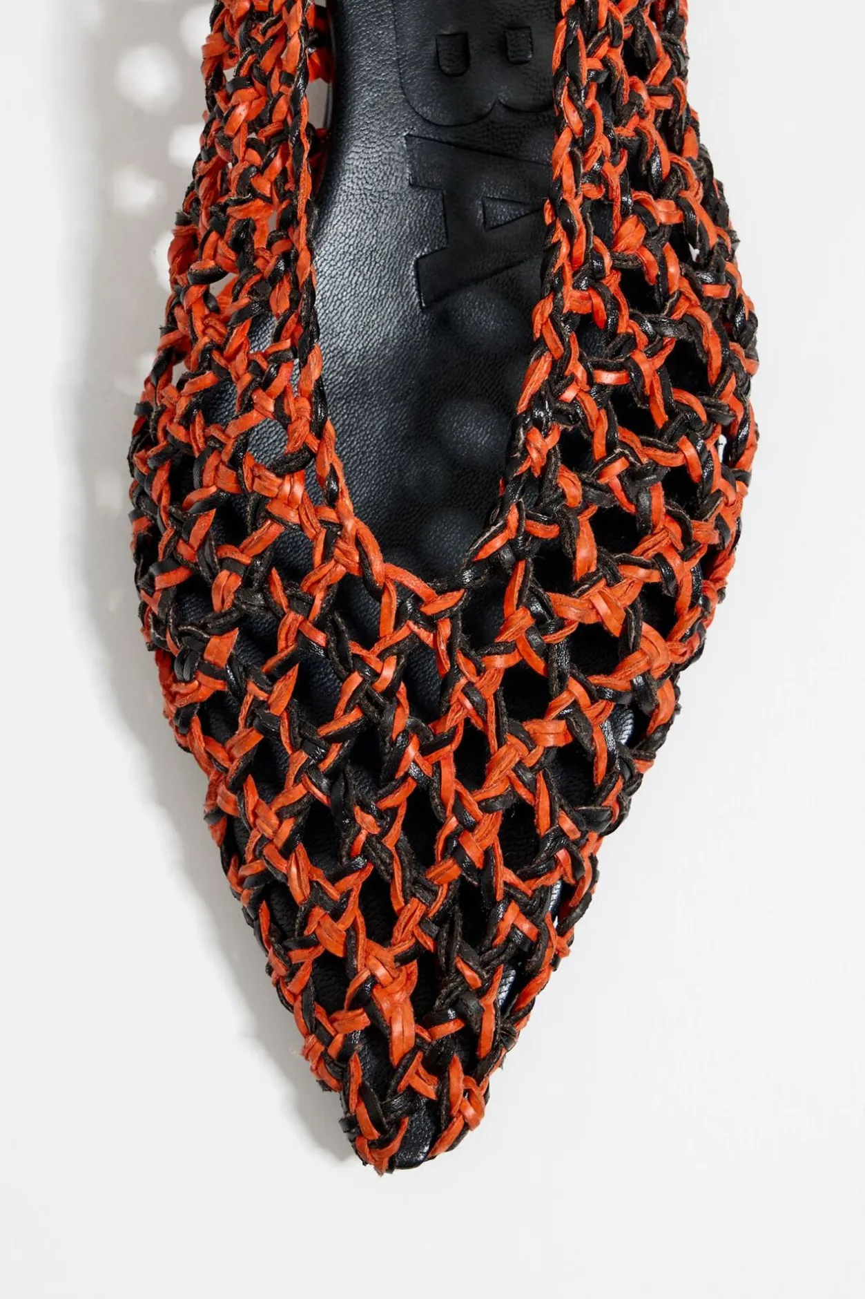 Bailarina Trenzada En Bicolor En Naranja Y Negro. Modelo Acabado En Punta Con Tirador Trasero. Plantilla De Piel Con Logo Grabado Y Suela Personalizada