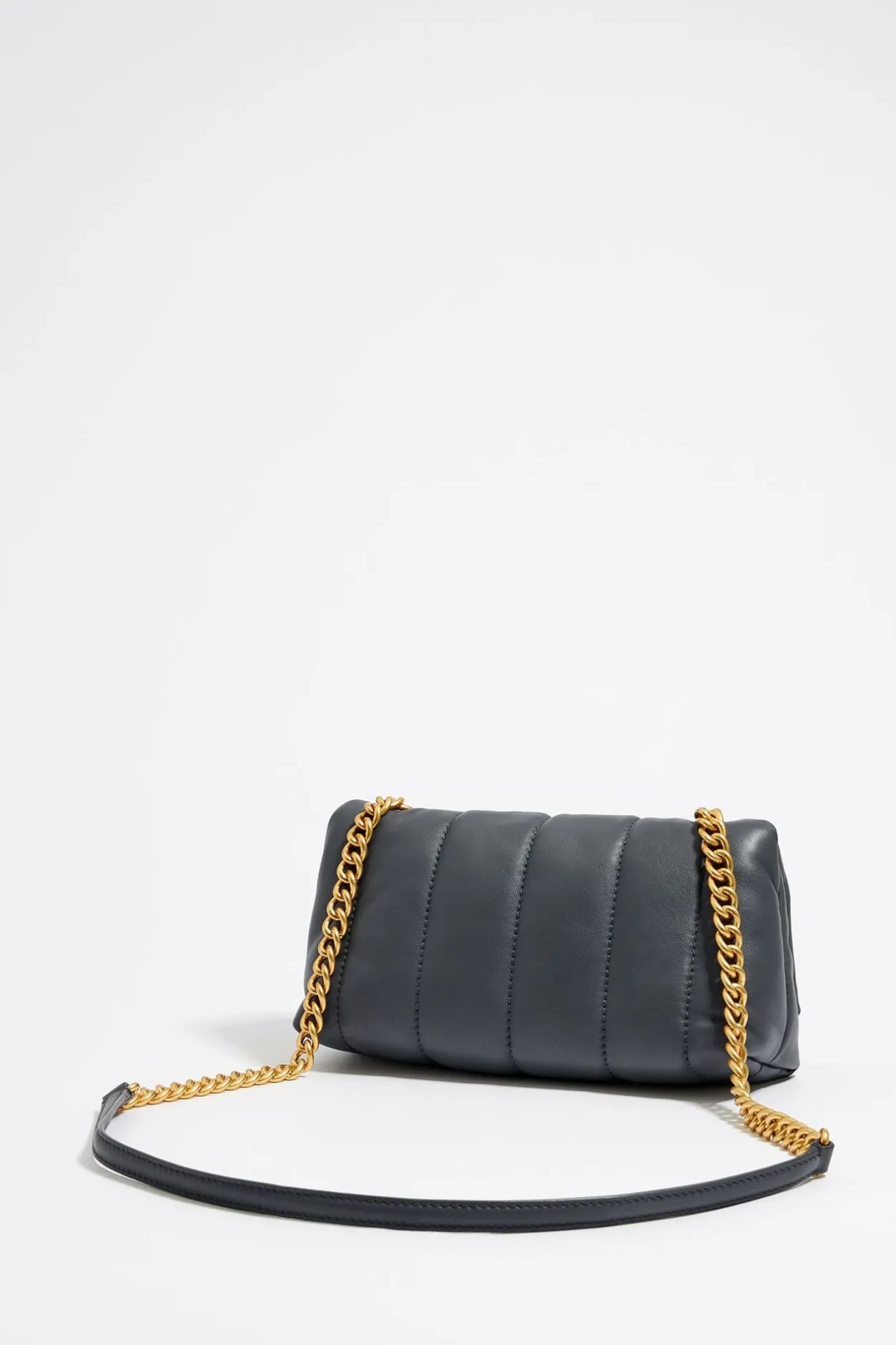 Bolso Bandolera De Piel Napa En Color Gris Azulado. Modelo De TamaÑO PequeÑO Con Cierre De Solapa Y Asa Bandolera De Piel Y De Cadena. Exterior Personalizado Con Logo Lb MetÁLico.