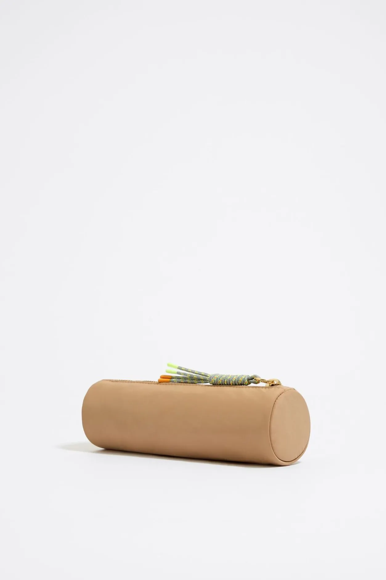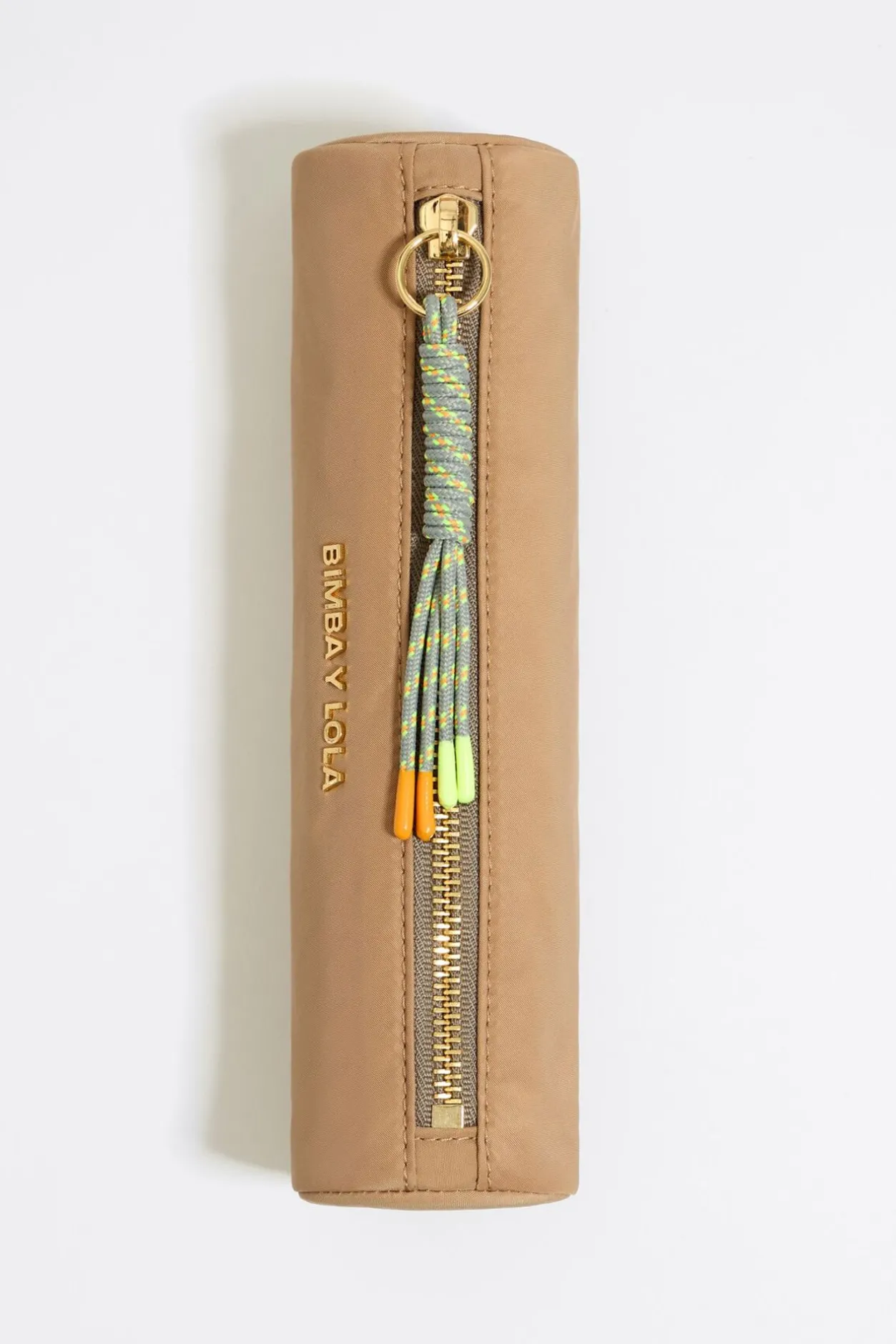 Estuche De Tejido TÉCnico En Color Galleta. Modelo En Forma De Cilindro Con Cierre De Cremallera Y Tirador De Cabo. Exterior Personalizado Con Logo MetÁLico. 100% PoliÉSter Reciclado.