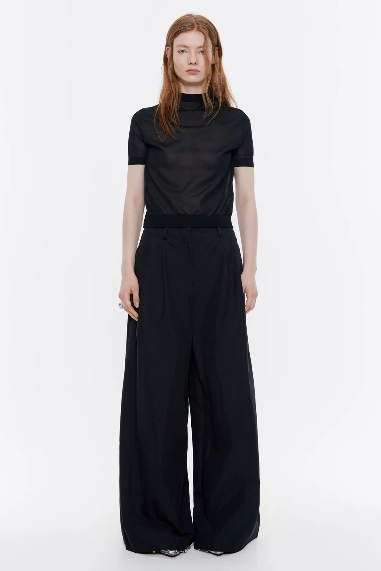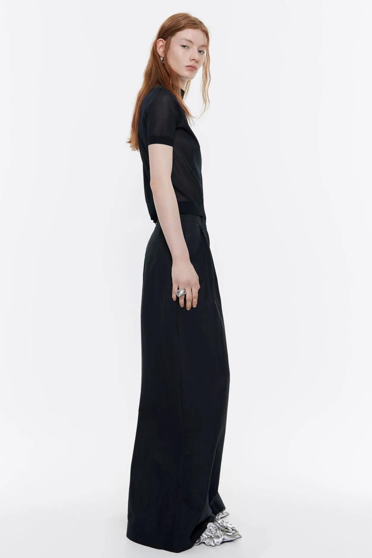 PantalÓN De AlgodÓN En Color Negro. Modelo De Corte Campana, Cierre De Cremallera Frontal, Bolsillos Laterales Y Cintura Con Maxipinzas Delanteras.