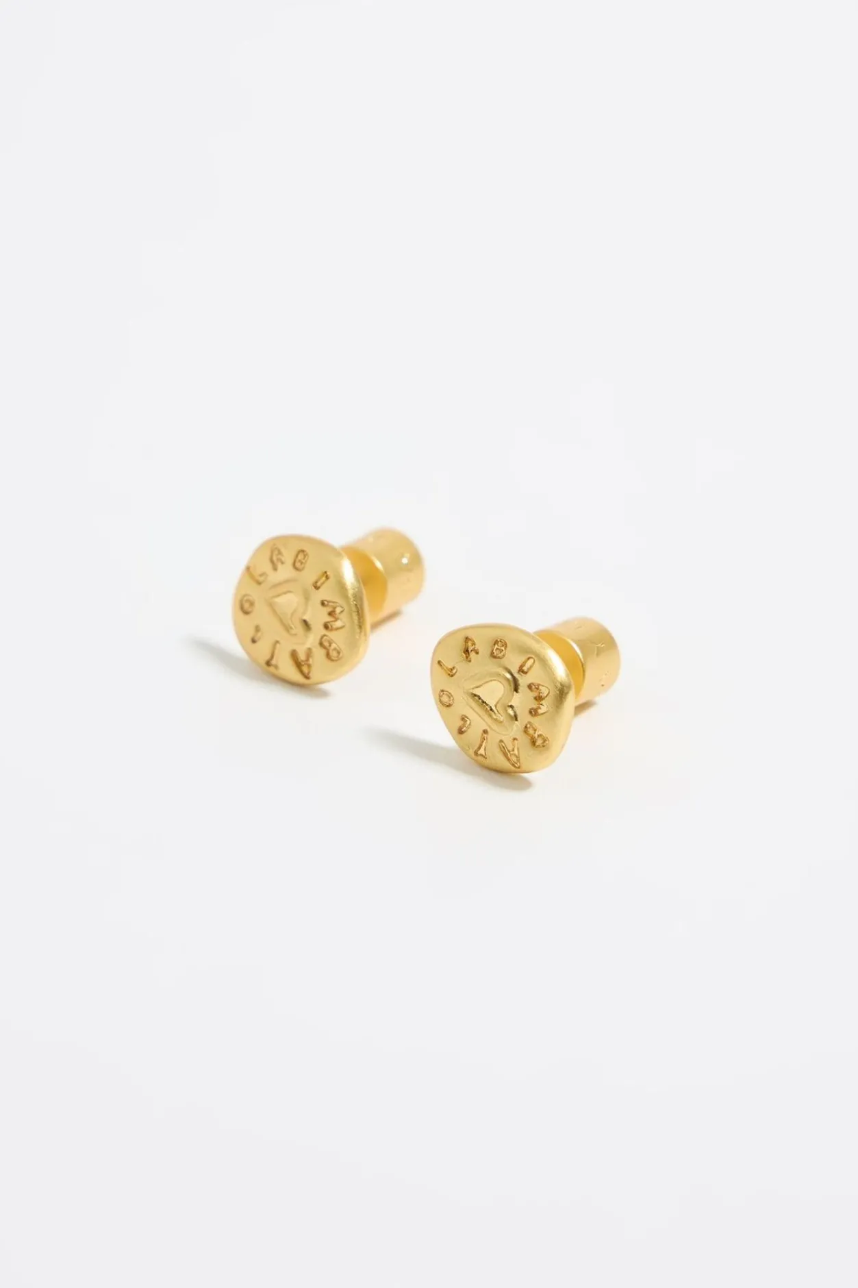 Pendientes De Metal Dorado Mate Con Logo. Modelo Con Cierre A PresiÓN. Personalizado Con El Logo Grabado.