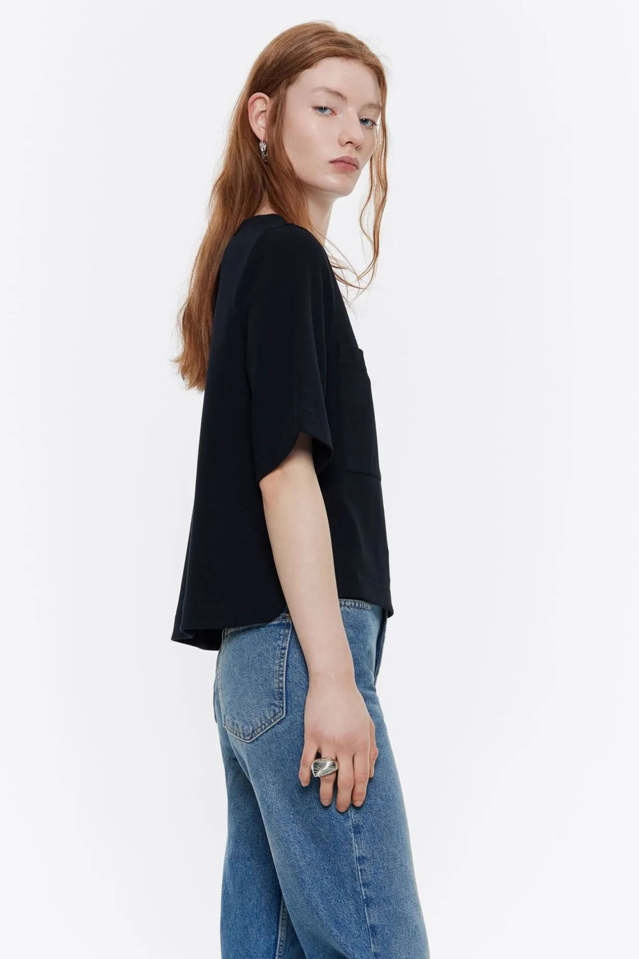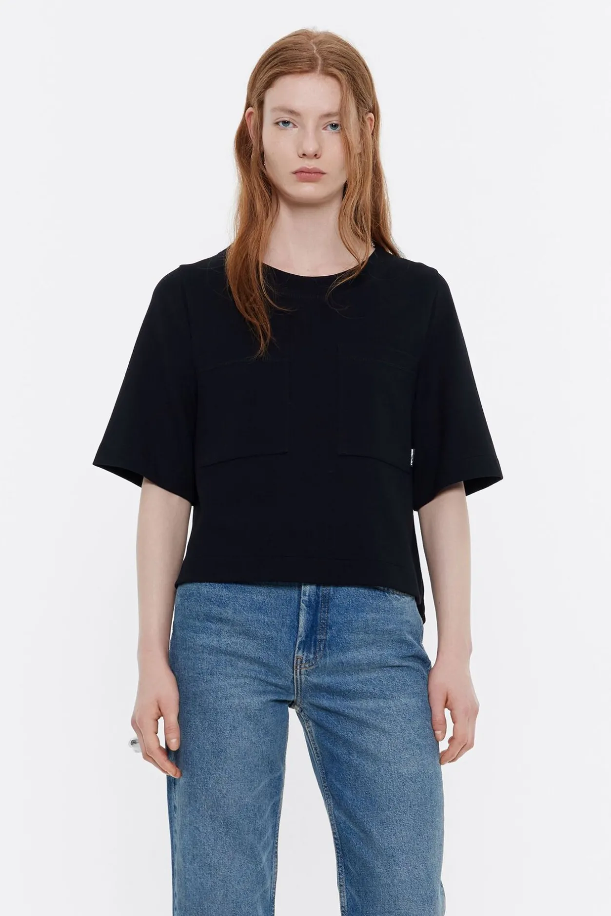 Top De Punto Roma En Color Negro. Modelo De Corte Recto, Escote Caja, Manga Corta, Bolsillos De PlastrÓN En El Delantero Y Exterior Personalizado Con Etiqueta Logotipada. Desnivel En El Delantero Y En La Espalda, Y PequeÑAs Aberturas Laterales.
