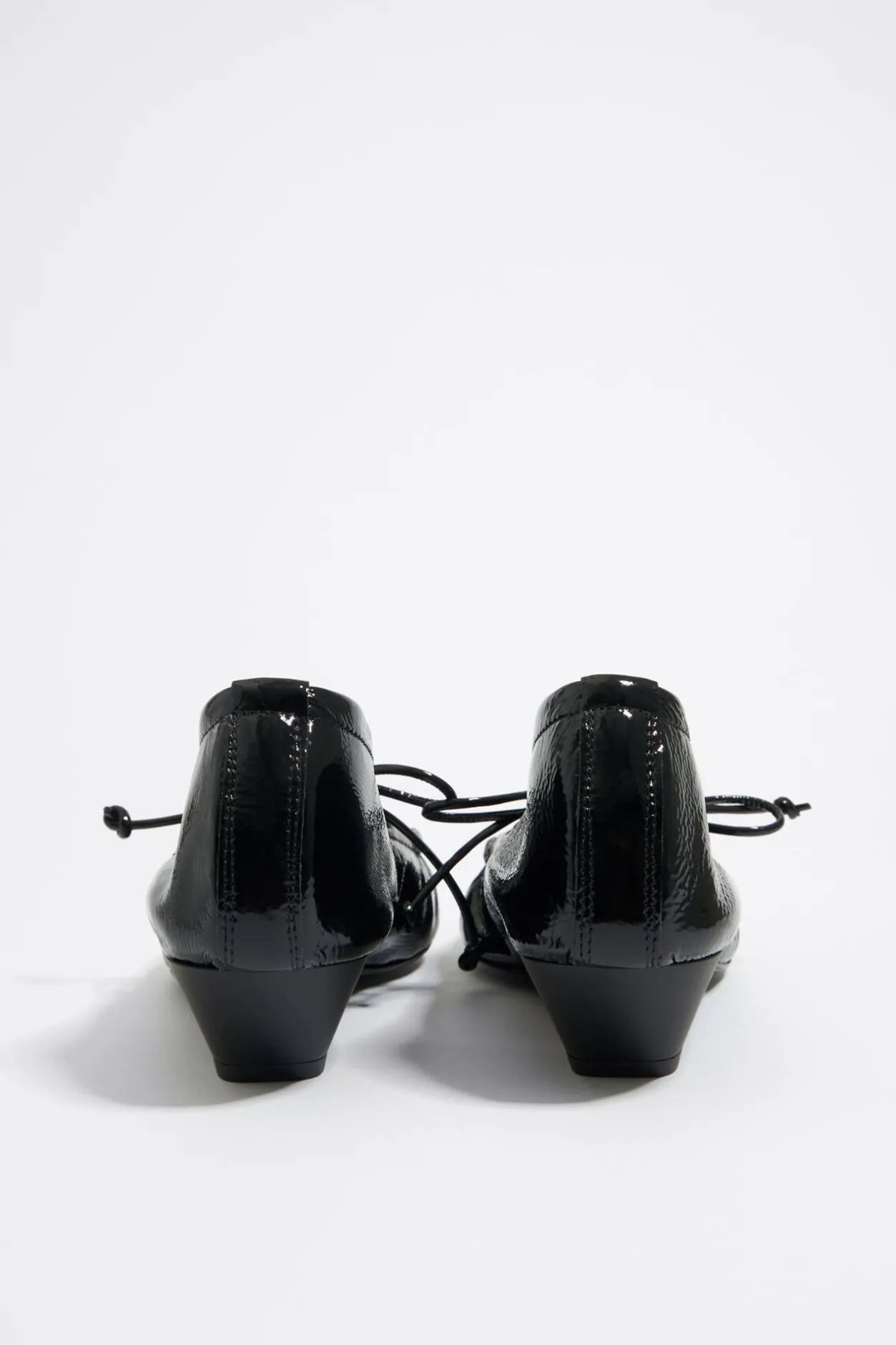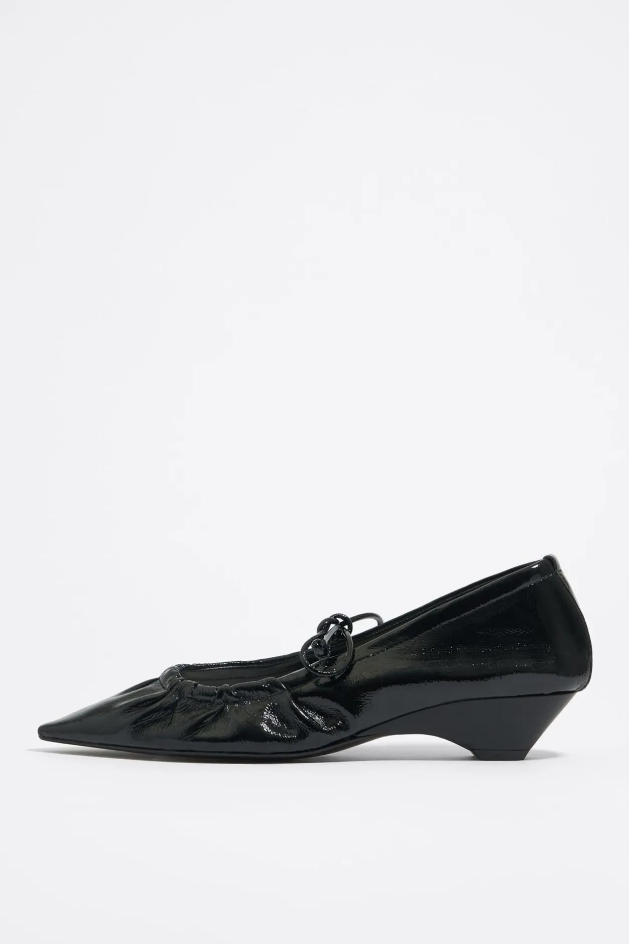 Zapato SalÓN De Piel Con Acabado Brillante En Color Negro. Modelo Acabado En Punta, Sin Forro Y Con Escote Fruncido Ajustable Con CordÓN De Piel. Plantilla Con Logo Grabado, Suela De Cuero Regenerado Moldeado Y Puntera Inyectada Logotipada.