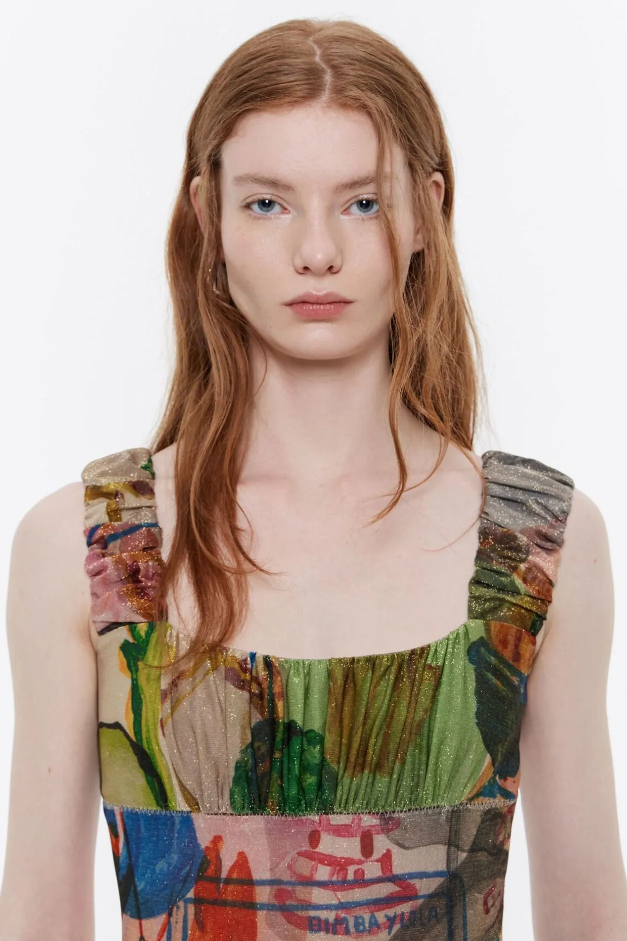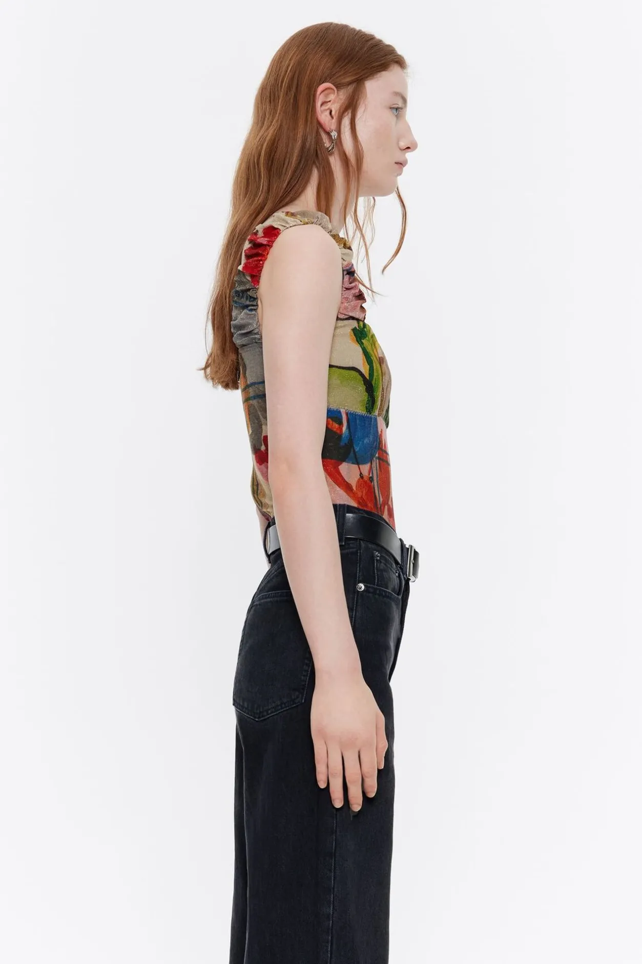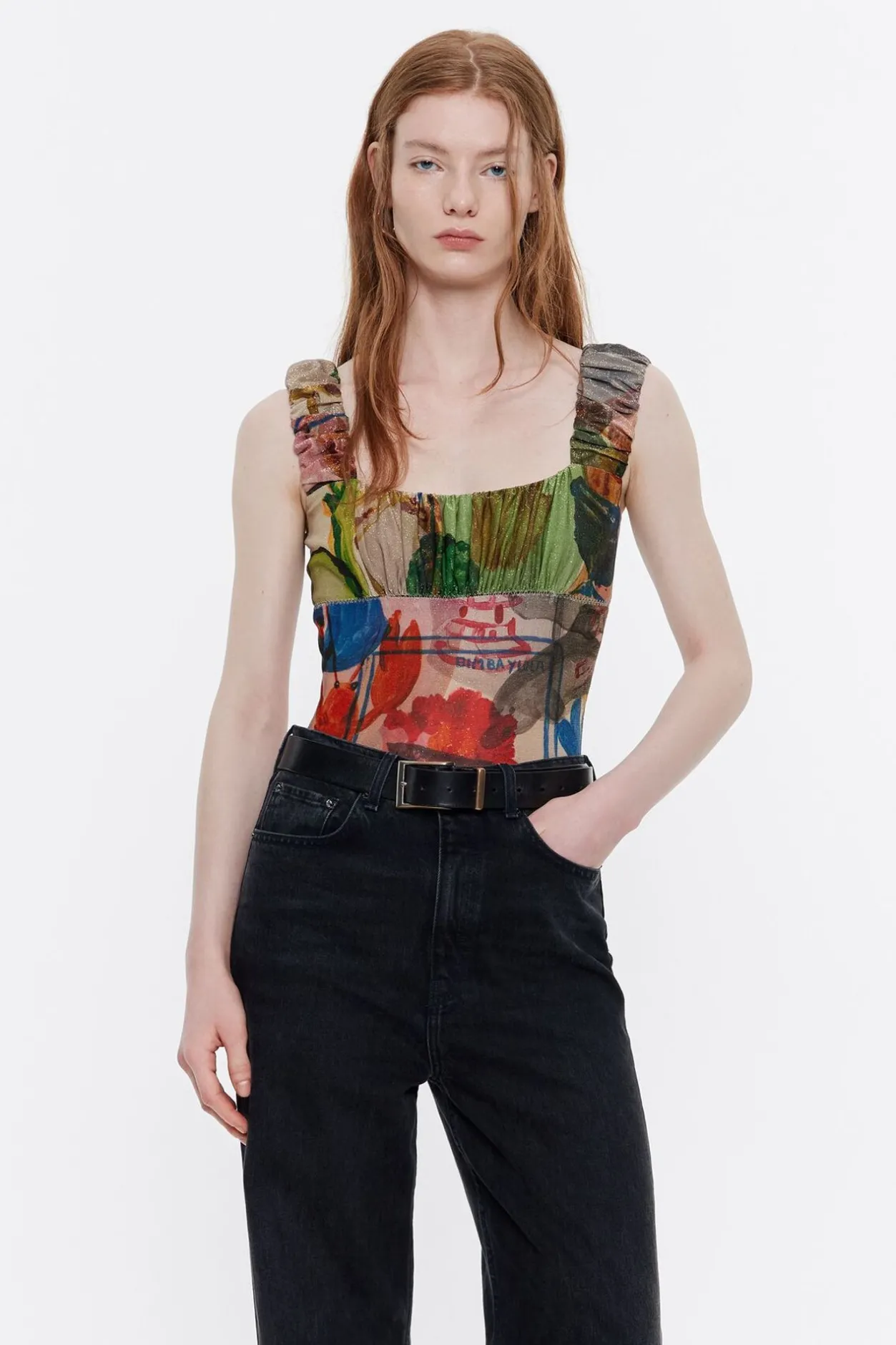 Body Ajustado En Tejido De FantasÍA Con Print Parque Full. Modelo De Escote Recto Fruncido Y Manga Sisa Con Tirantes Fruncidos.