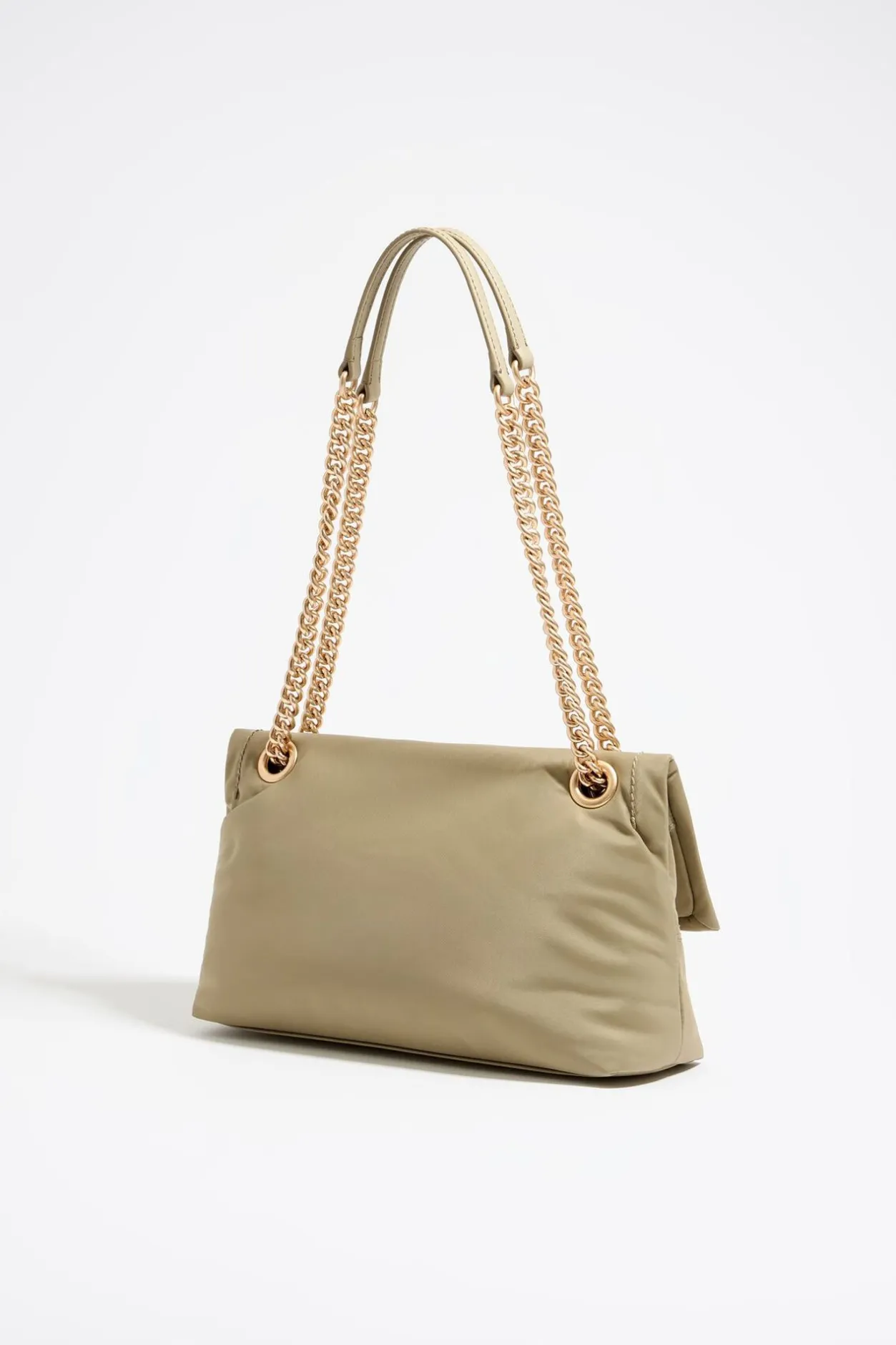 Bolso De Hombro De Tejido TÉCnico En Color Caqui Claro. Modelo De TamaÑO PequeÑO Con Solapa, Cierre MagnÉTico Y Doble Asa De Cadena Con Tiras De Piel. Exterior Personalizado Con Cantoneras Pespunteadas Y Logo Lb MetÁLico.