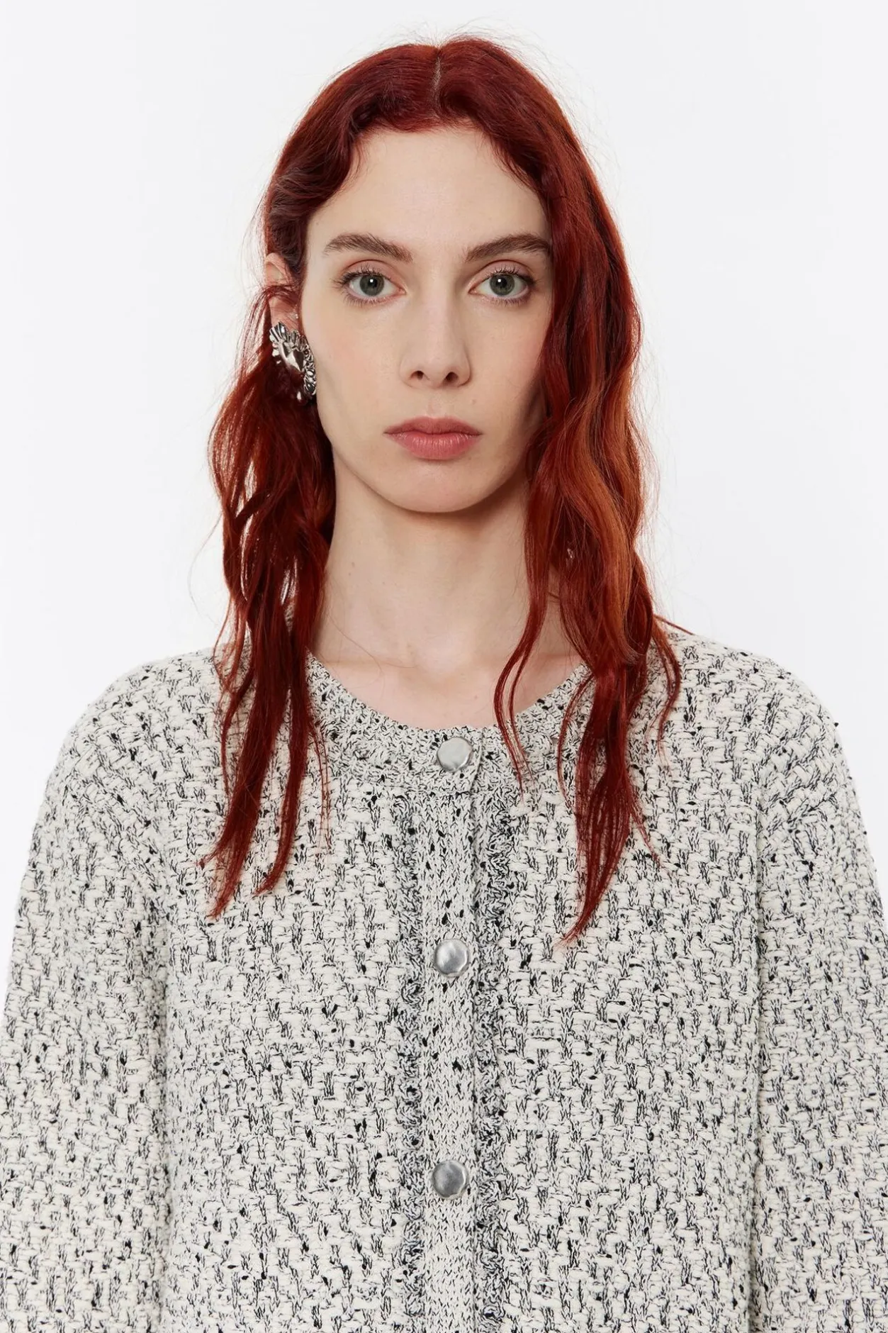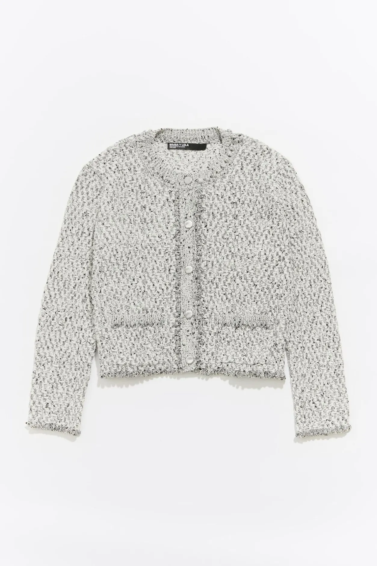 CÁRdigan Corto Jaspeado De AlgodÓN En Color Marfil. Modelo De Corte Recto, Escote Caja, Manga Larga Y Cierre Frontal De Botonadura. Vivo BouclÉ En Escote, Bolsillos Y PuÑOs.