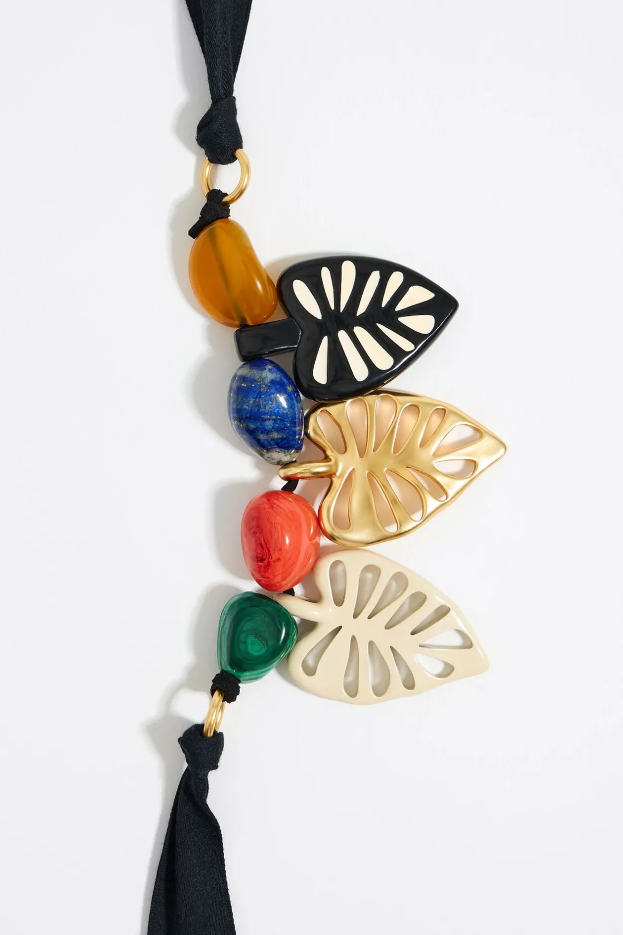 Collar Con Piedras Y Piezas En Forma De Hojas En Dorado Mate. Modelo Con Cierre De Largo Ajustable Con Cinta Para Atar. Personalizado Con Etiqueta Logotipada.