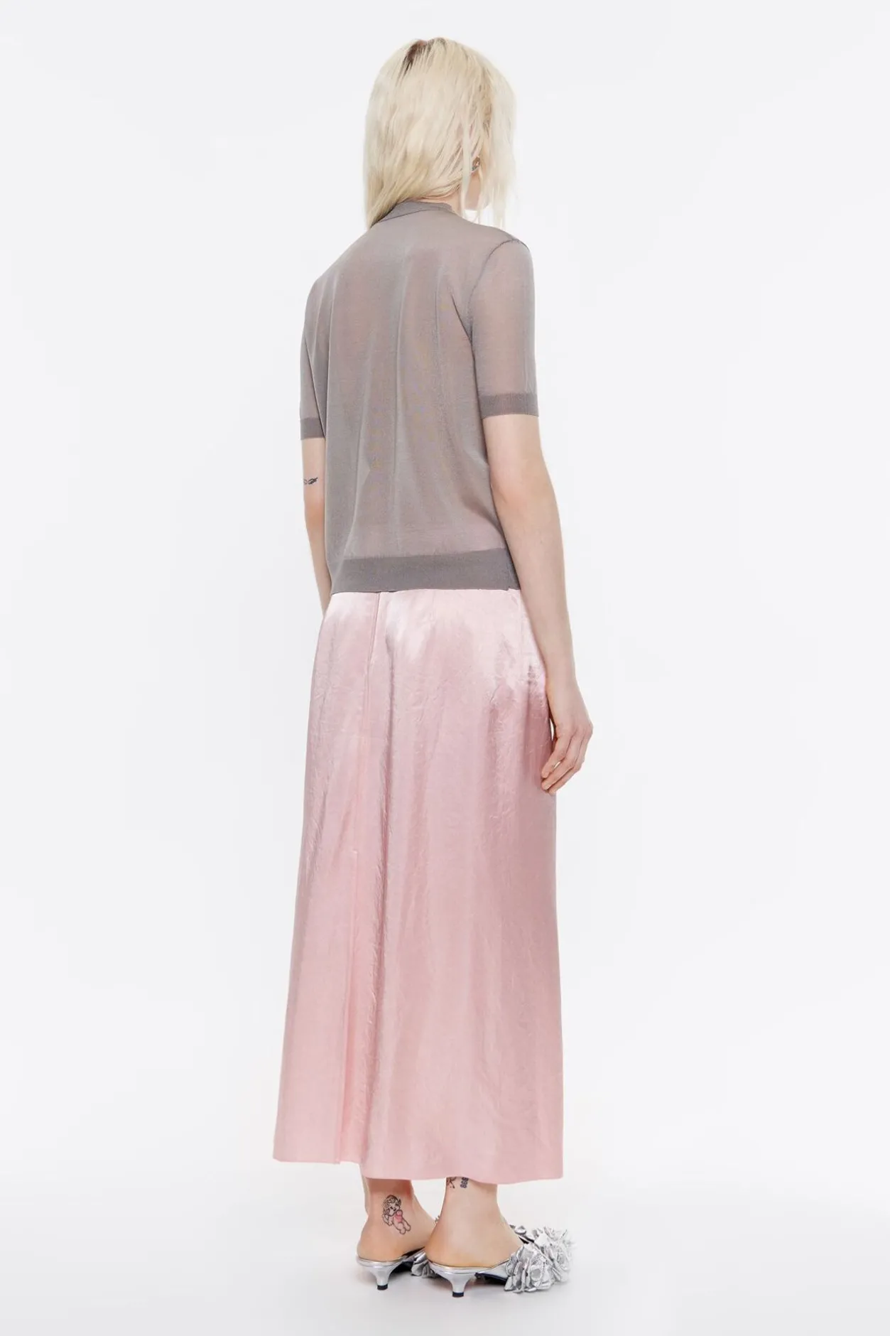 Falda Midi De SatÉN En Color Rosa Claro. Modelo De Corte Recto, Cierre De Cremallera Invisible Trasera Y Abertura Trasera En El Bajo.