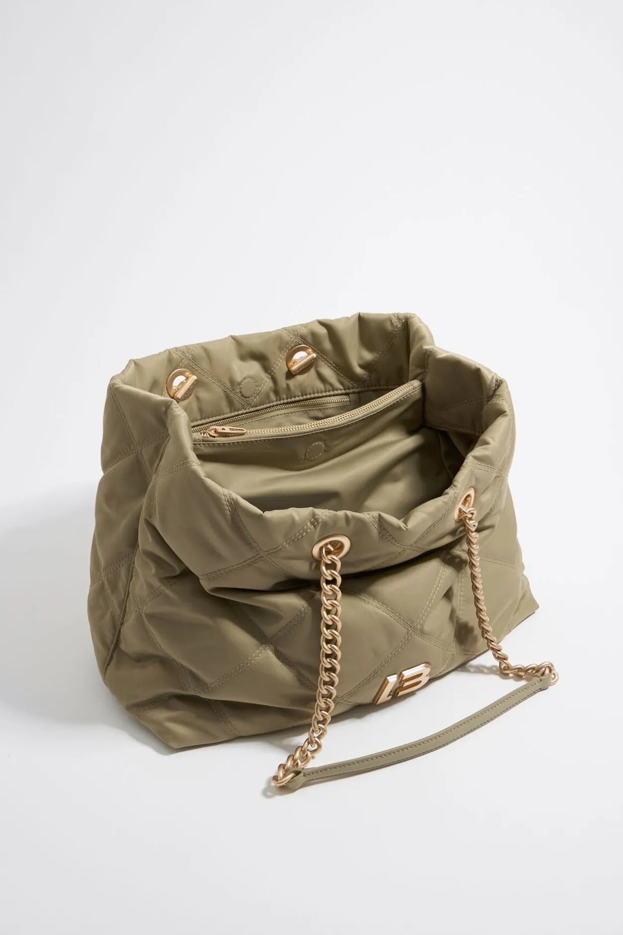 Bolso Shopper De Nylon Acolchado En Color Caqui Claro. Modelo De TamaÑO Grande, Cierre MagnÉTico, Asa De Piel Y Cadena, Bolsillo Interior Y Pies MetÁLicos. Exterior Personalizado Con Logo Lb.