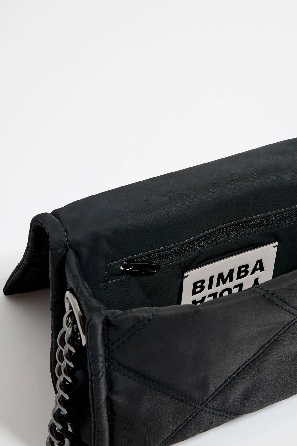 Bolso Bandolera De Tejido TÉCnico Acolchado En Color Negro. Modelo De TamaÑO PequeÑO, Cierre De Solapa Con Detalles De Piel Y Doble Asa, De Tejido Y De Cadena. Exterior Personalizado Con Logo Lb MetÁLico. 100% PoliÉSter Reciclado.