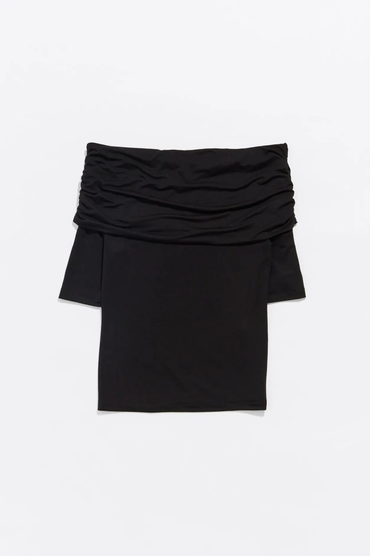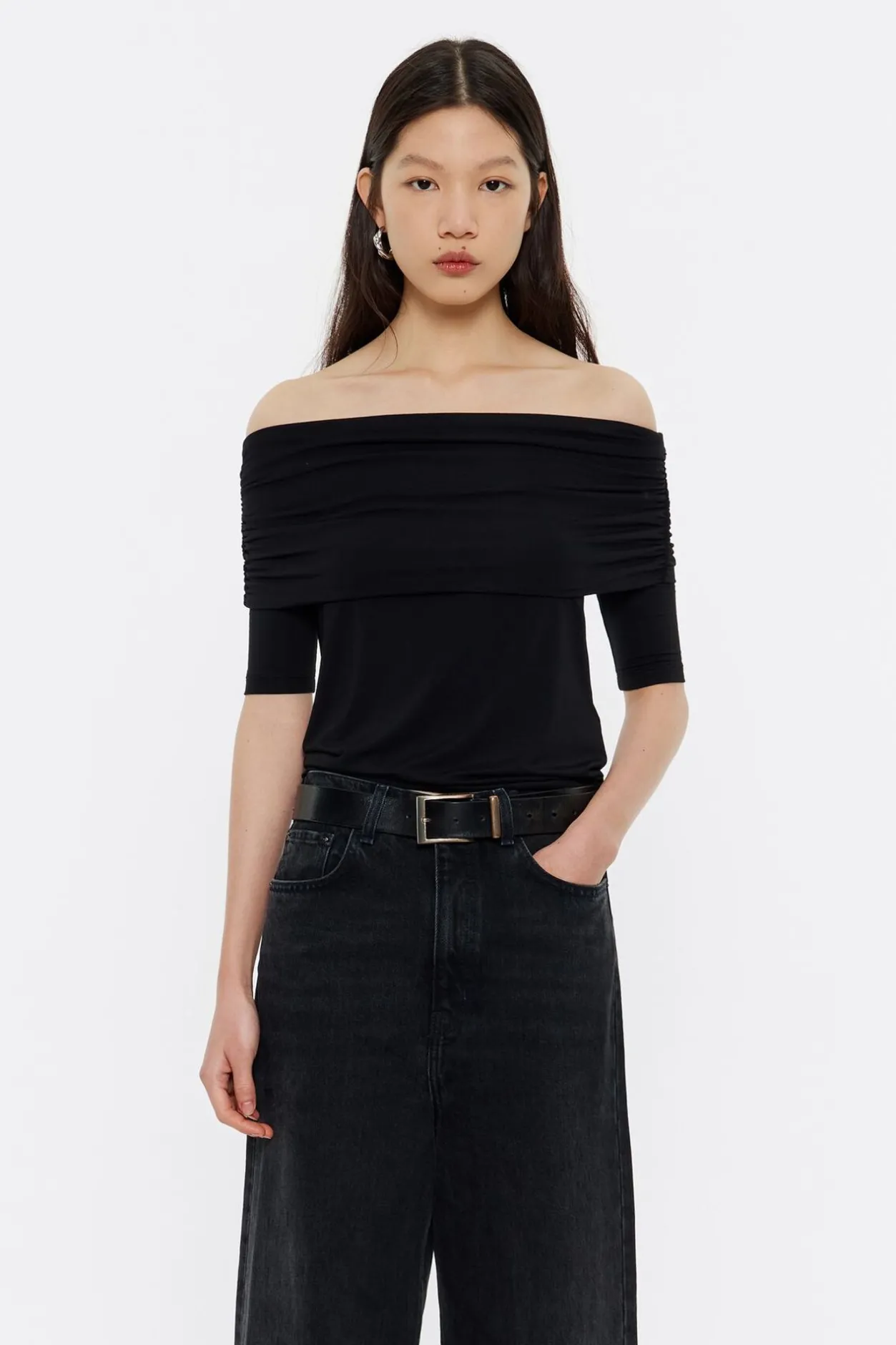Camiseta De Viscosa En Color Negro. Modelo De Corte Ajustado, Escote Recto Con Vuelta, Hombros Descubiertos Y Manga Ajustada 3/4.