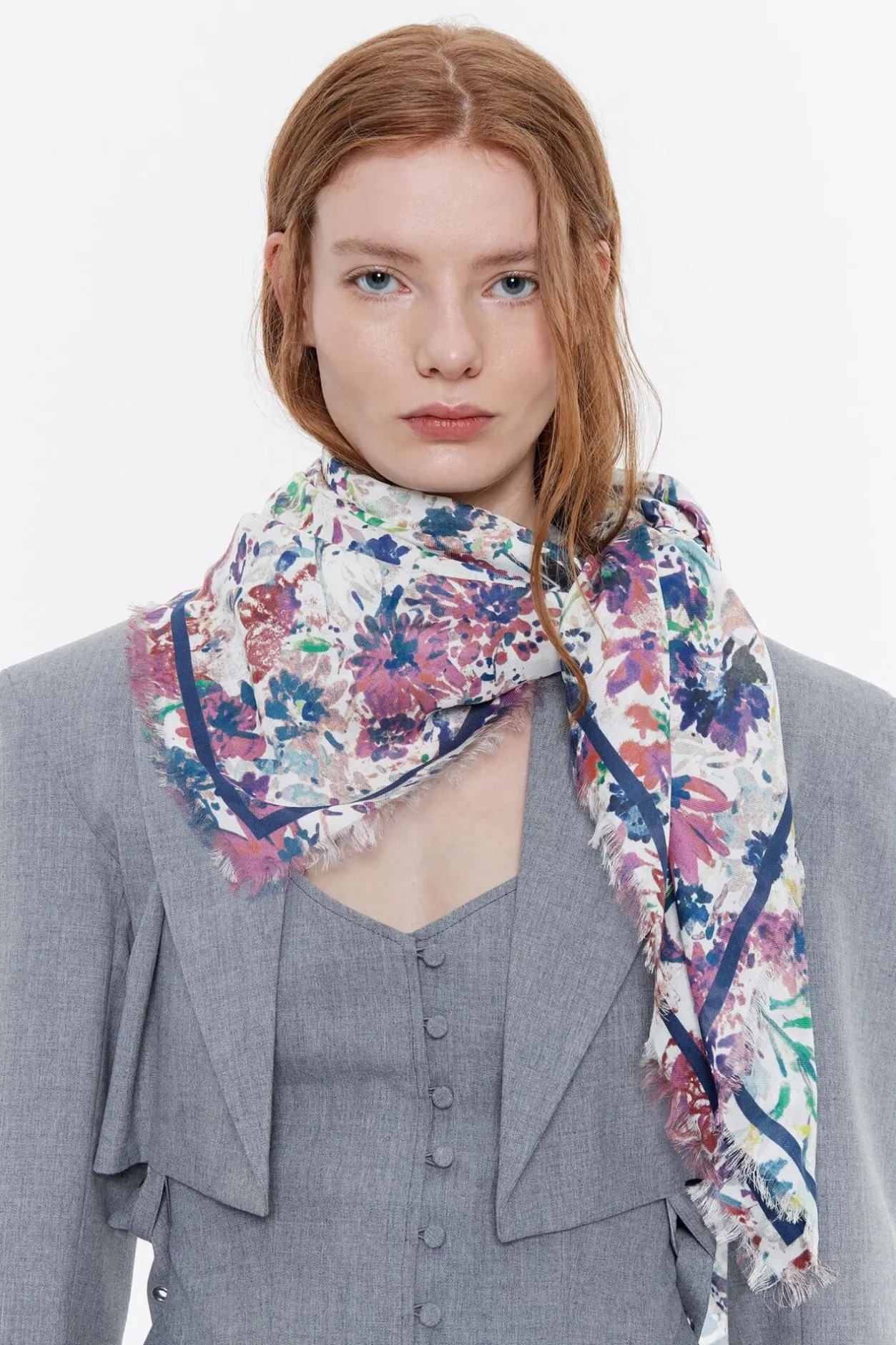 Chal Cuadrado Con Estampado De Flores En Acuarela Sobre Fondo Color Blanco Roto. Modelo Personalizado Con Etiqueta Logo.