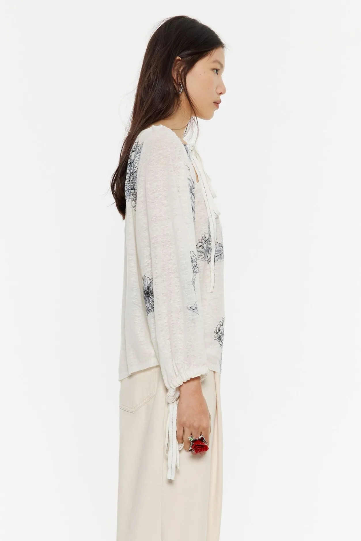 Jersey De Lino Con Print Canary Pop En Color Blanco. Modelo De Corte Recto, Escote Caja Fruncido Con Lazos Para Ajustar Y Manga 3/4 Con Lazos En El PuÑO Para Ajustar.