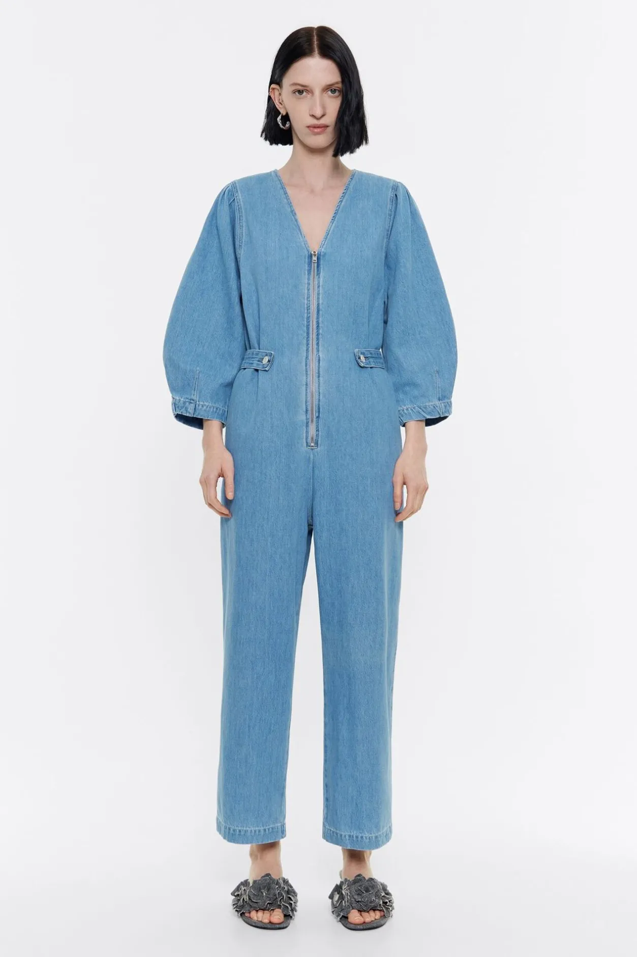 Mono Denim En Color Azul. Modelo De Corte Recto, Largo Tobillero, Escote Pico Pronunciado, Manga 3/4 Abullonada Y Cierre Con Cremallera MetÁLica Frontal. PequeÑOs Cinturones Ajustables En Cintura.