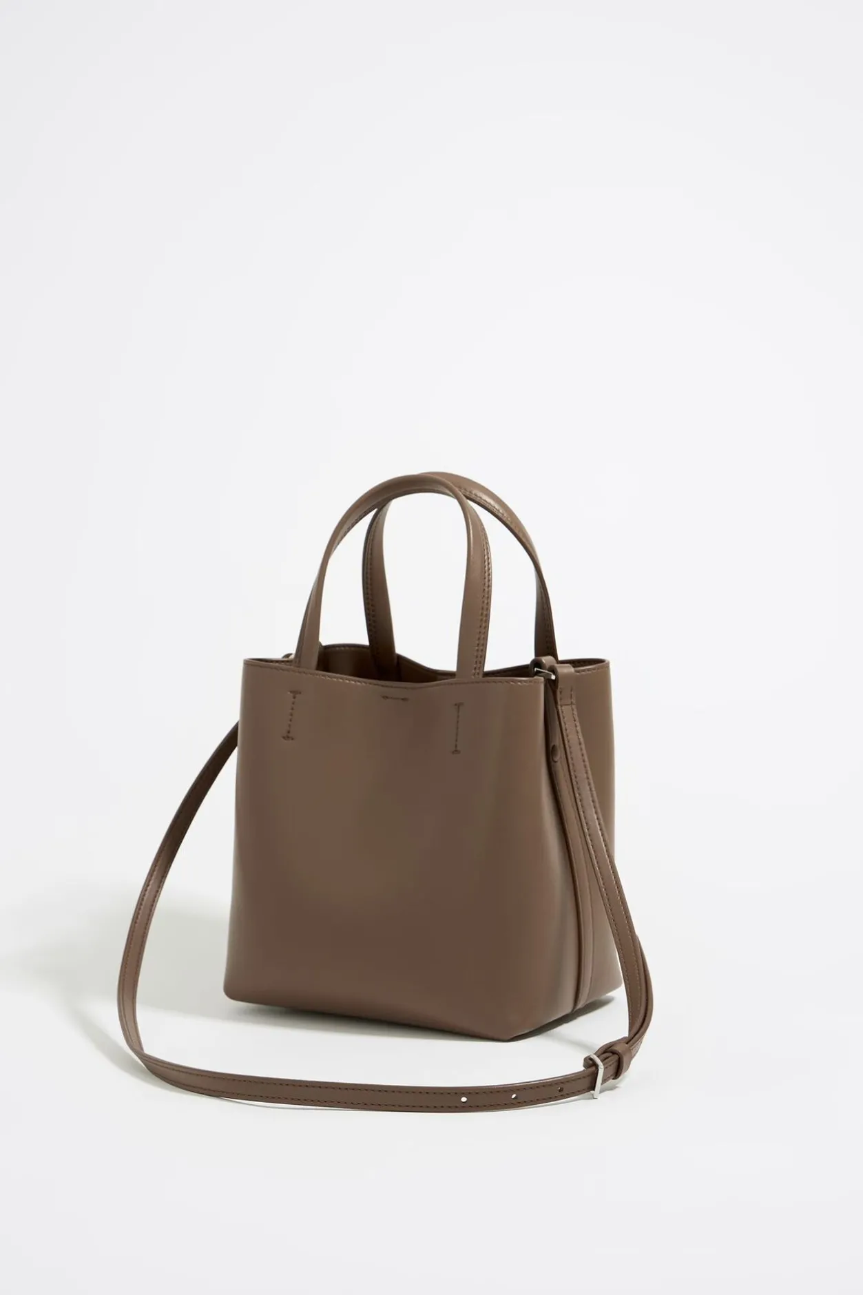 Bolso De Mano Chihuahua De Piel Reconstituida En Color Topo Oscuro. Modelo De TamaÑO PequeÑO, Cierre A PresiÓN, Doble Asa De Mano, Asa Larga De Piel Ajustable Y Bolsillo Interior Con Cremallera. Exterior Personalizado Con Logo MetÁLico.