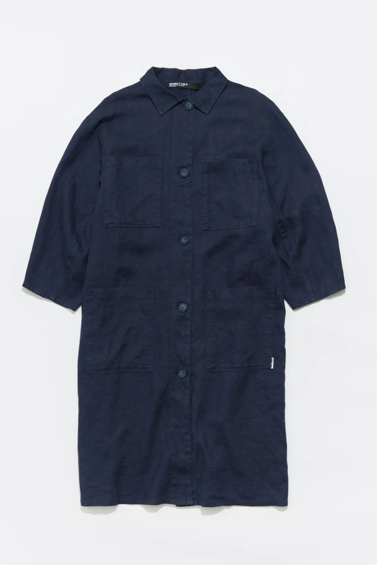 Chaqueta Midi De Lino En Color Azul Marino. Modelo De Corte Recto, Cuello Camisero, Manga Larga Recta, Cierre Frontal De Botonadura Y Bolsillos De PlastrÓN En El Delantero. Exterior Personalizado Con Etiqueta Logotipada.