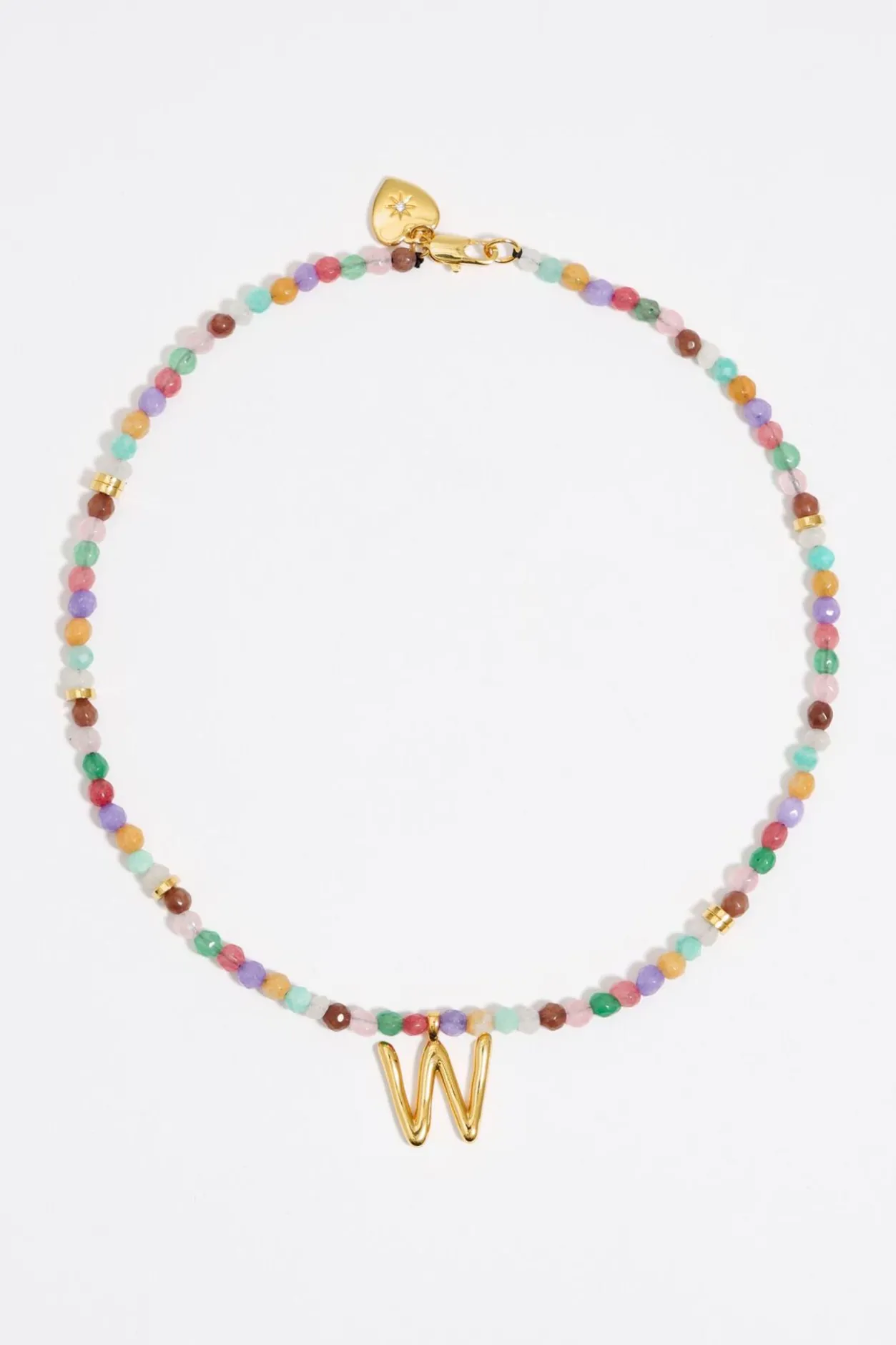 Collar Corto De Piedras Multicolores Con Letra W De Metal Dorado. Modelo Con Cierre De MosquetÓN Y Pieza En Forma De CorazÓN De Metal Dorado Con Cristal.