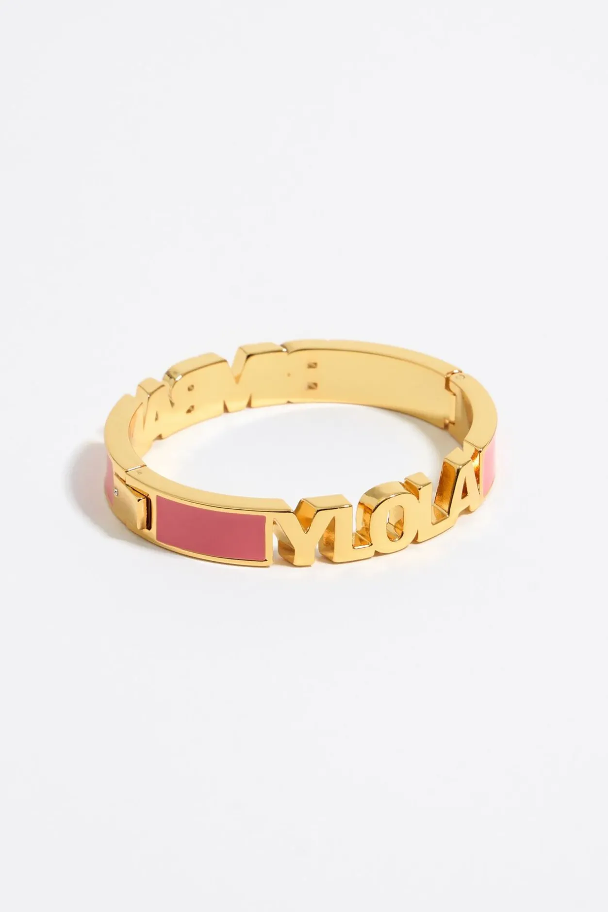 Pulsera De Metal Dorado Con Logo Y Esmalte En Color Coral. Modelo Con Cierre De Bisagra.