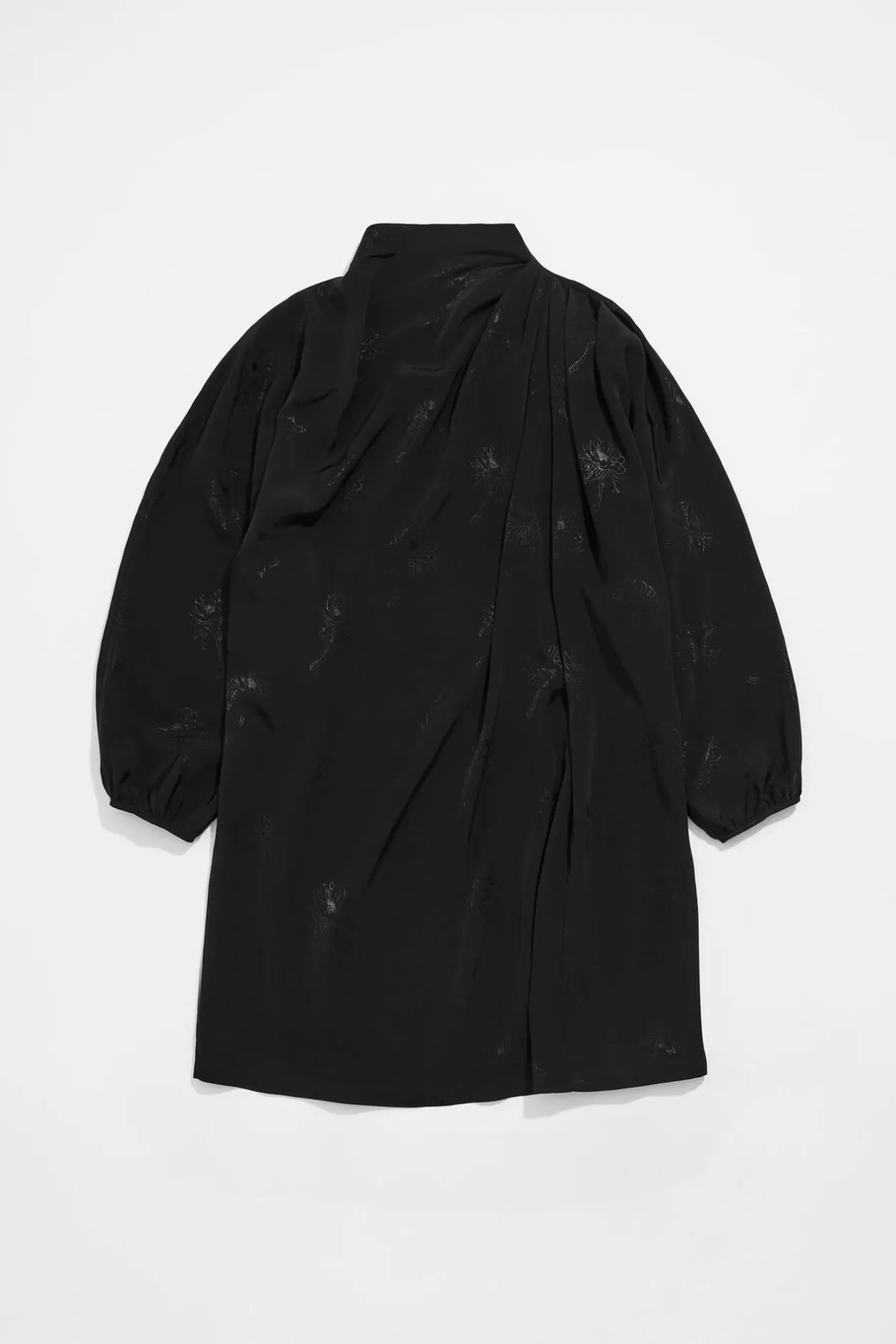 Vestido Mini De Jacquard En Color Negro. Modelo De Corte Recto, Cuello Subido, Manga Larga Y Botonadura Trasera. Hombro Con Plisados Y PuÑO Fruncido Con BotÓN.
