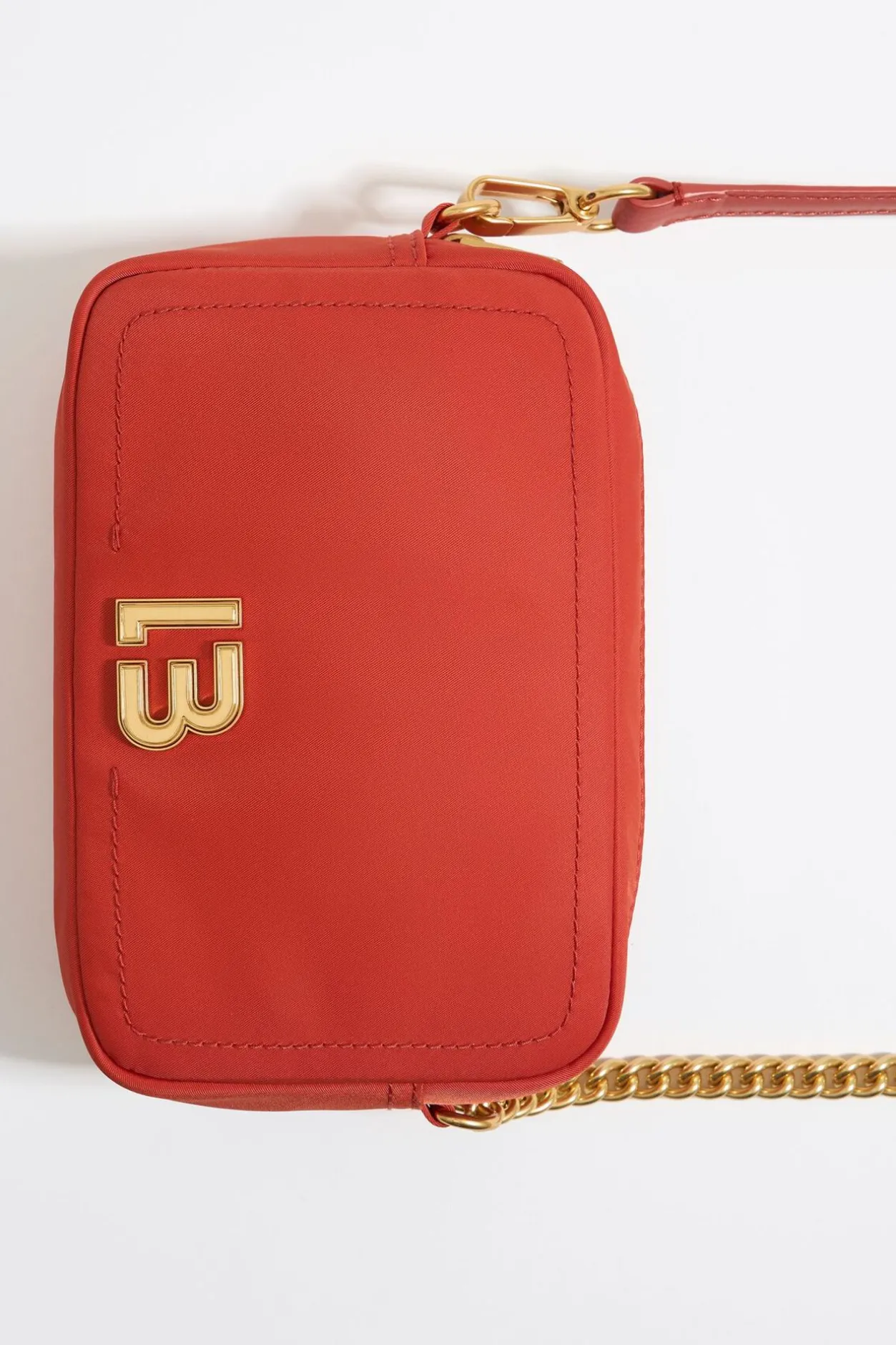 Bolso Bandolera De Nylon En Color Coral. Modelo De TamaÑO Mini, Cierre De Cremallera, Asa Larga De Piel Y Cadena, Y Bolsillo Interior. Exterior Personalizado Con Logo Lb. Este Modelo Contiene 100% PoliÉSter Reciclado.