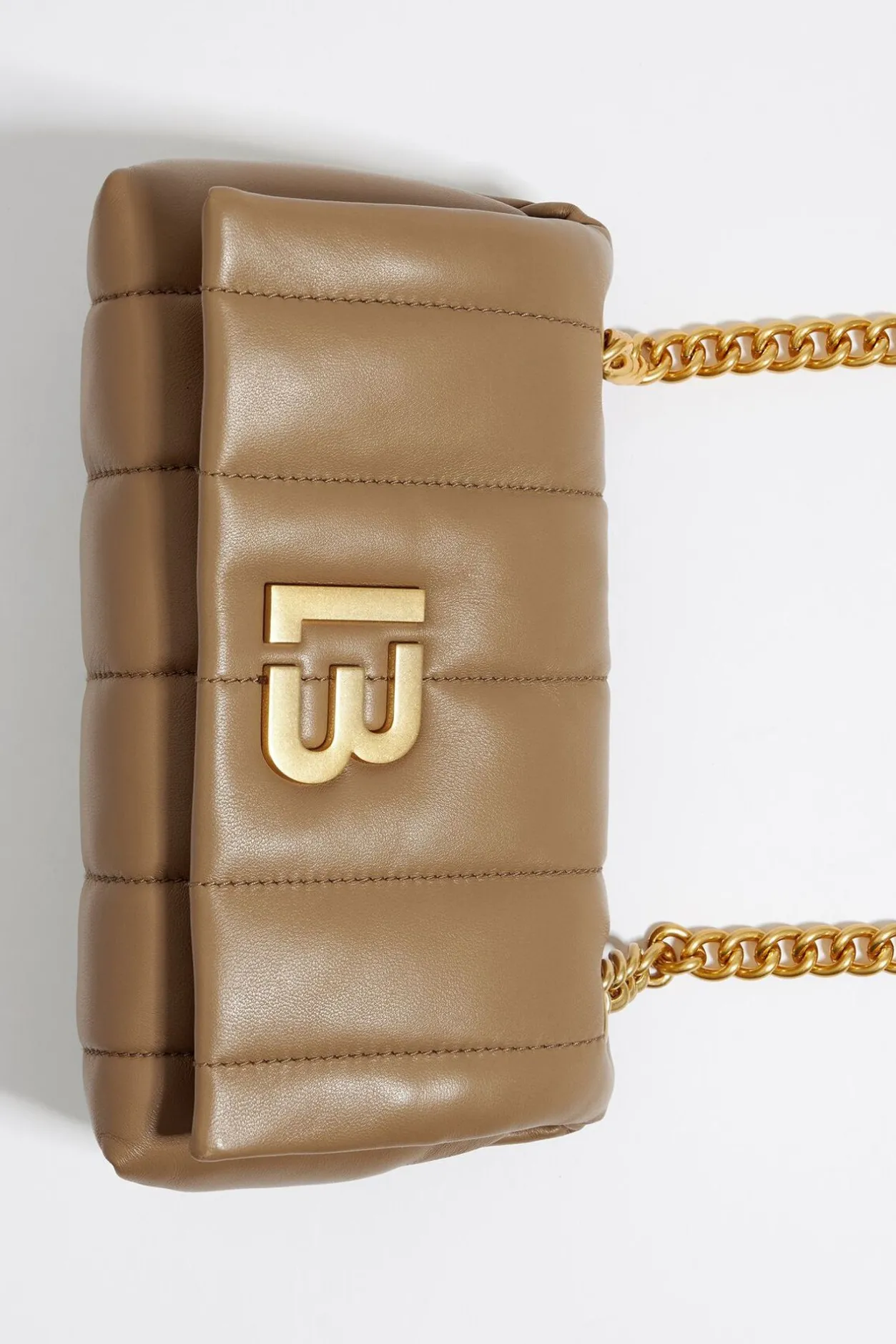 Bolso Bandolera De Piel Napa En Color Topo Oscuro. Modelo De TamaÑO PequeÑO Con Cierre De Solapa Y Asa Bandolera De Piel Y De Cadena. Exterior Personalizado Con Logo Lb MetÁLico.