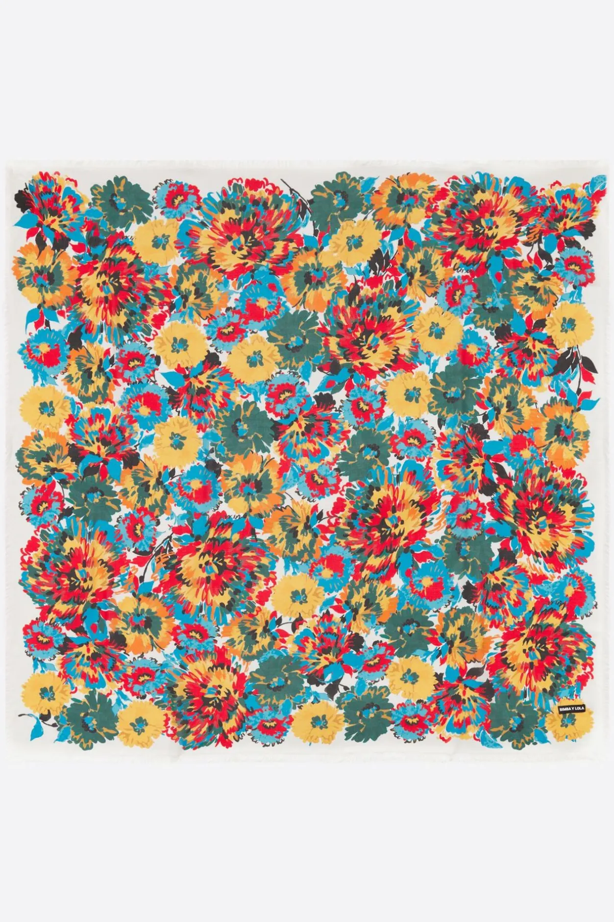 Chal Cuadrado De Flores Rotulador Sobre Fondo Color Blanco. Modelo Personalizado Con Etiqueta Logotipada.