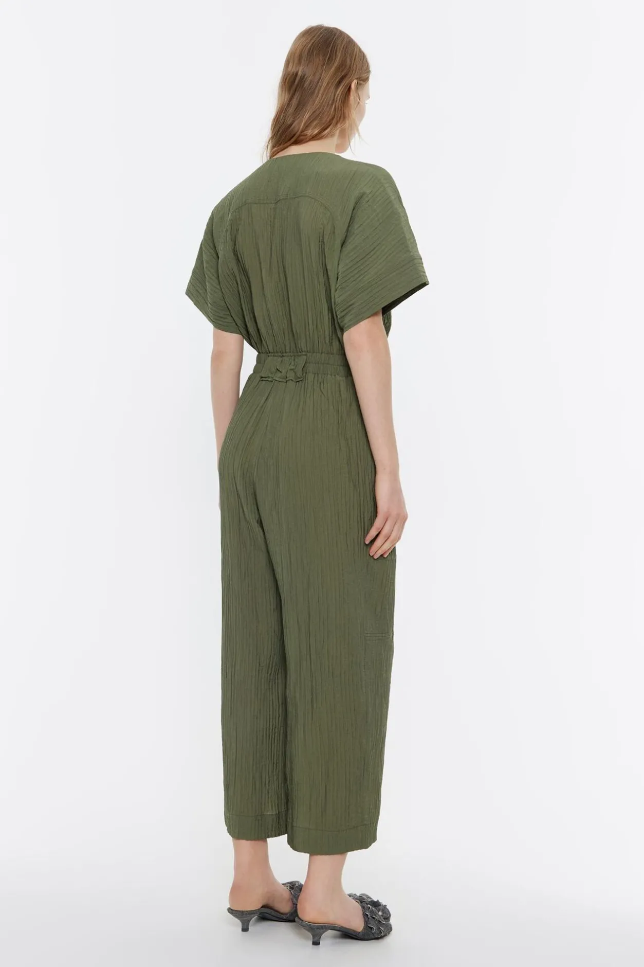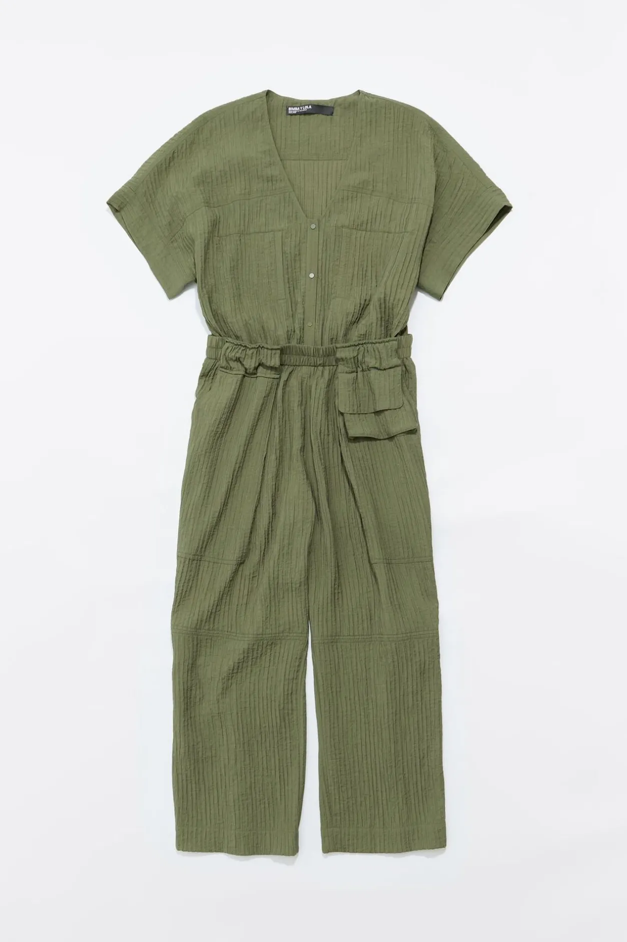 Mono Cargo De Viscosa Con Textura En Color Caqui. Modelo Con Largo Tobillero, Escote En V Pronunciado, Manga Corta Y Cierre Frontal Con Botonadura De PresiÓN. Bolsillos Saco En Los Laterales, Cintura Fruncida Con Goma Interior Y Pespuntes Triples En Toda La Prenda.