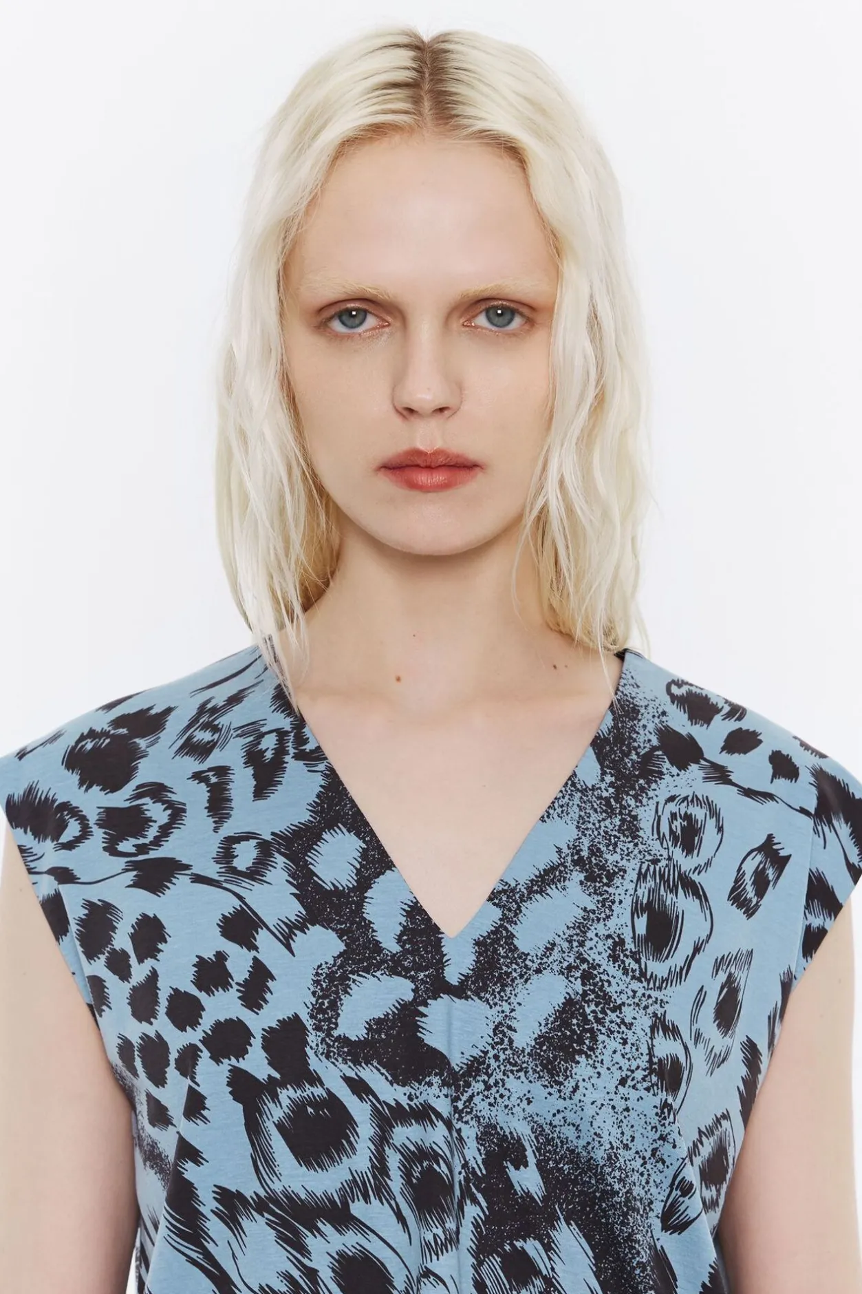 Camiseta De AlgodÓN Con Print Animal Mix En Color Azul. Modelo De Corte Recto, Escote En V En Delantero Y Espalda, Y Manga Sisa.