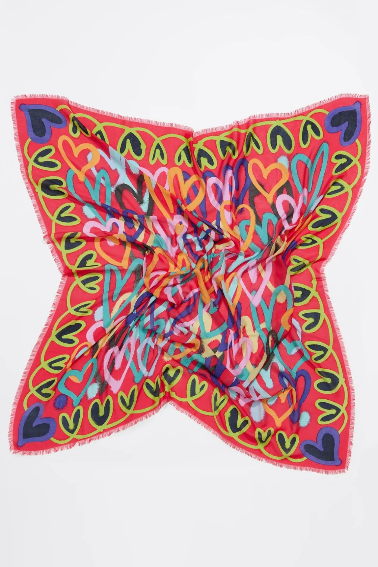 Chal Cuadrado Con Estampado De Corazones Multicolor Con Trazo De Grafiti Sobre Fondo Fresa.