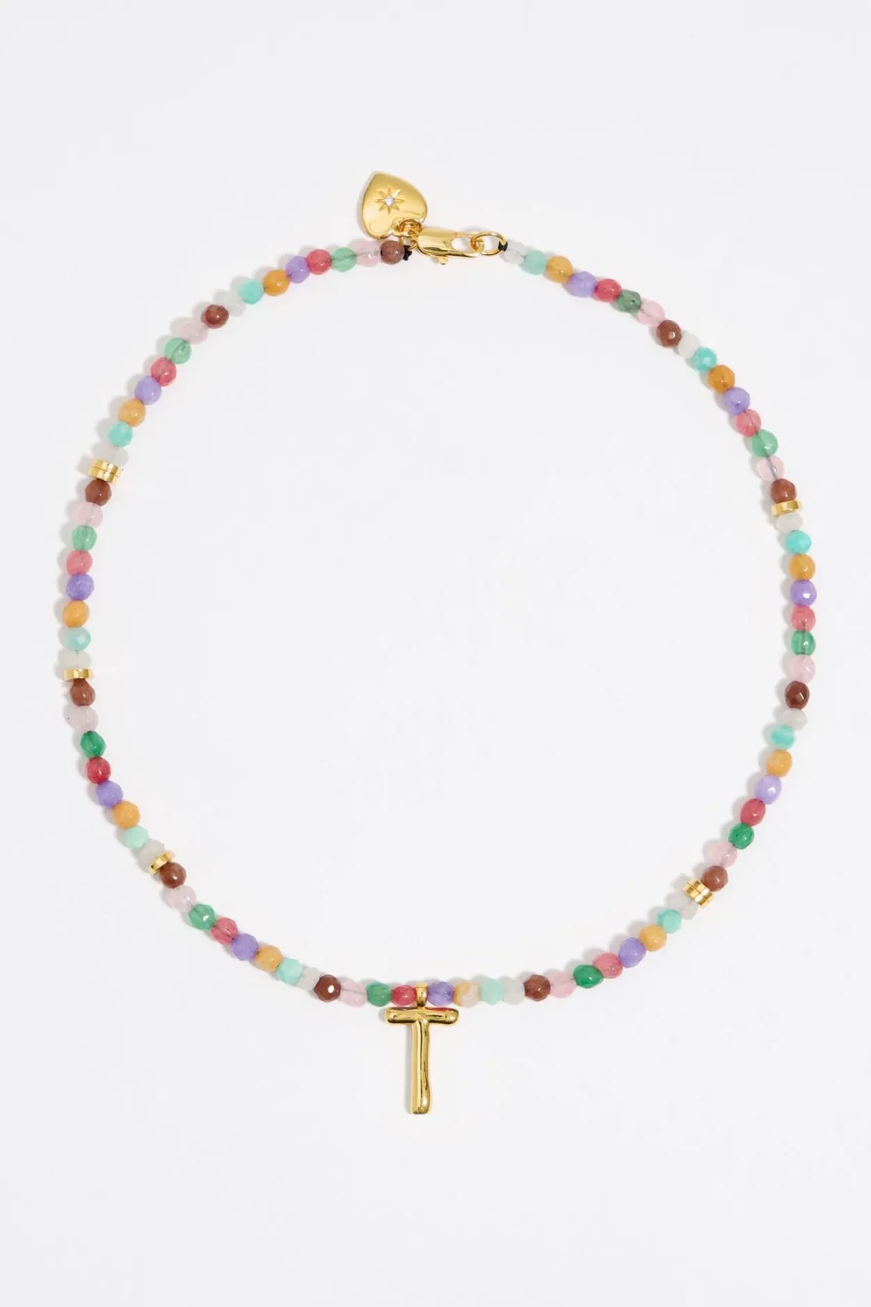 Collar Corto De Piedras Multicolores Con Letra T De Metal Dorado. Modelo Con Cierre De MosquetÓN Y Pieza En Forma De CorazÓN De Metal Dorado Con Cristal.