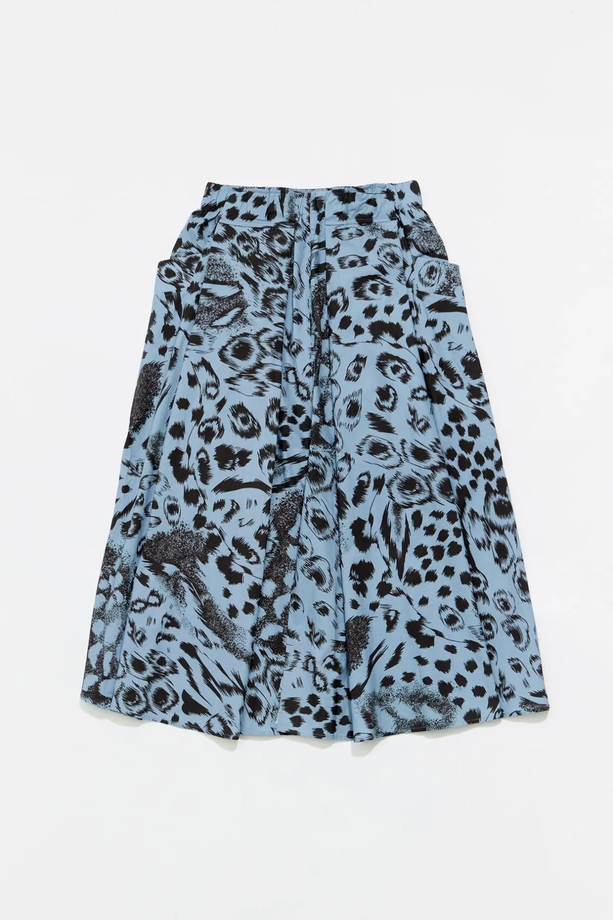 Falda De AlgodÓN Con Print Animal Mix En Color Azul. Modelo De Corte LÍNea A, Cintura ElÁStica Con Maxipliegues En Delantero Y Espalda, Y Bolsillos Laterales.