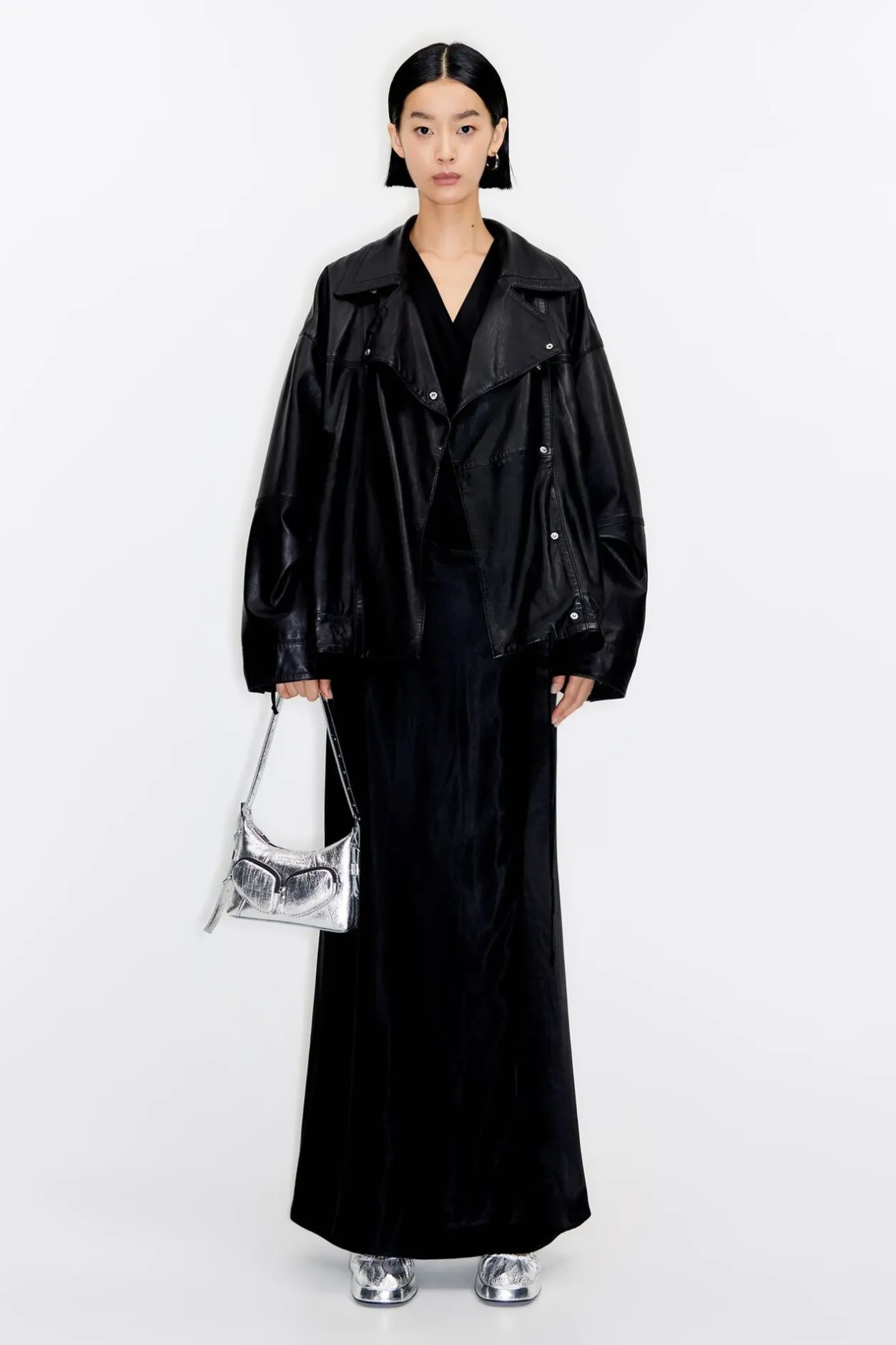 Vestido Cruzado Largo De SatÉN En Color Negro. Modelo De Corte Recto, Escote Pronunciado En Pico, Manga Larga Y Cierre Cruzado Con Lazada Lateral. PuÑO Con Lazada.