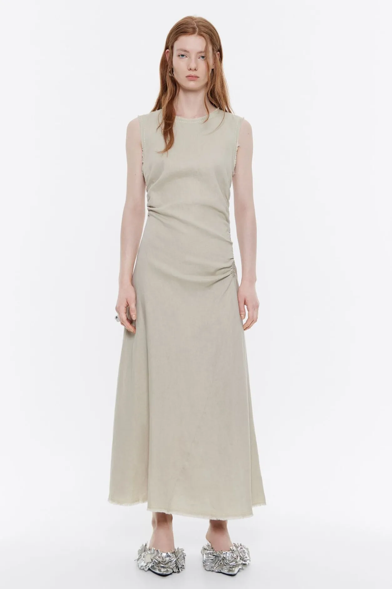 Vestido Midi De Lino En Color Arena. Modelo De Corte LÍNea A, Escote Caja, Manga Sisa Con Pespunte Bordado Y Desflecado, Y Cierre Trasero Con Lazos. Cintura Fruncida En Laterales Y Bajo Con Pespunte Bordado Y Desflecado.