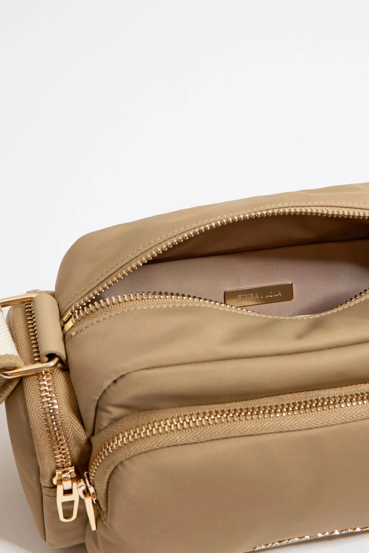 Bolso Bandolera De Nylon Con Multibolsillos En Color Tostado. Modelo De TamaÑO PequeÑO, Cierre De Cremallera, Asa Larga De Tejido, Bolsillo Interior Y Piezas De Piel. Exterior Personalizado Con Logo MetÁLico. Este Modelo Contiene 100% PoliÉSter Reciclado.