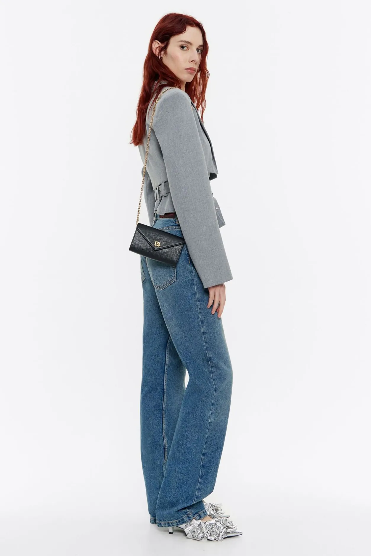 Bolso De Piel En Color Negro. Modelo De TamaÑO Mini, Cierre A PresiÓN, Asa Larga De Cadena Y Bolsillo Interior. Exterior Personalizado Con Logo Lb. Este Modelo Contiene 100% AlgodÓN Reciclado.