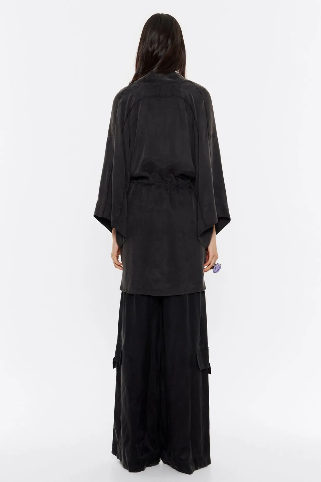 Camisa Kimono Larga De Lyocell En Color Negro Lavado. Modelo De Corte Recto, Escote Pronunciado Cruzado, Manga 3/4 Con Pespuntes En PuÑO Y Cierre De Botonadura Frontal. Cintura Ajustable Con Cordones.