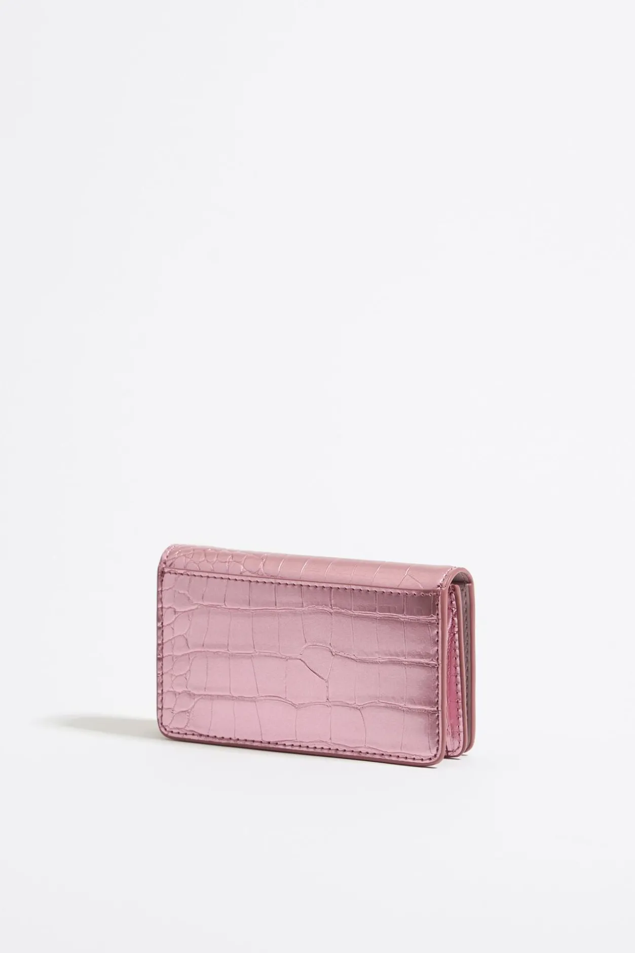Cartera Solapa Con Grabado De Cocodrilo En Color Rosa Claro. Modelo Con Cierre A PresiÓN, Asa De Cadena E Interior Con Monedero Y Tarjetero. Exterior Personalizado Con Logo MetÁLico.