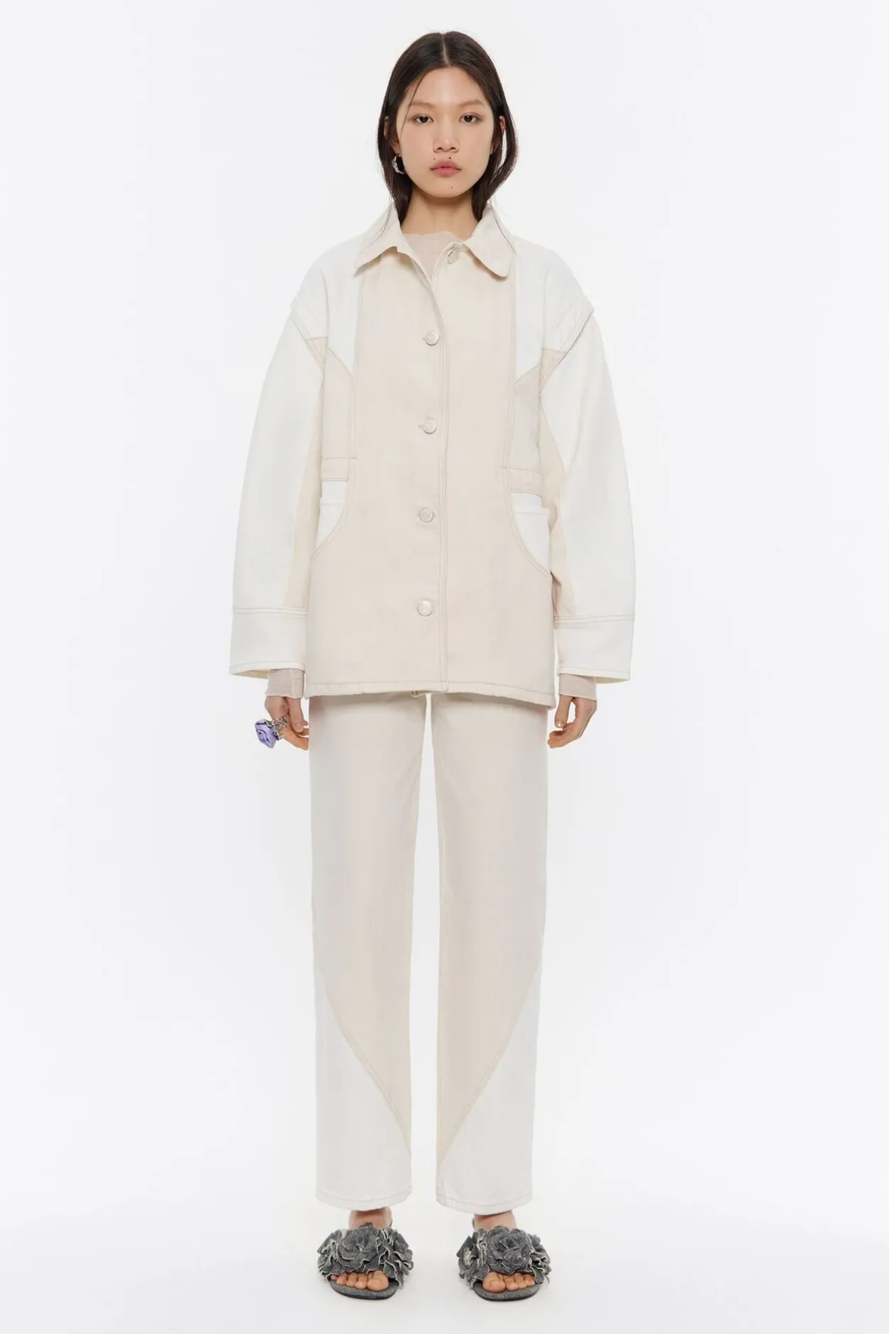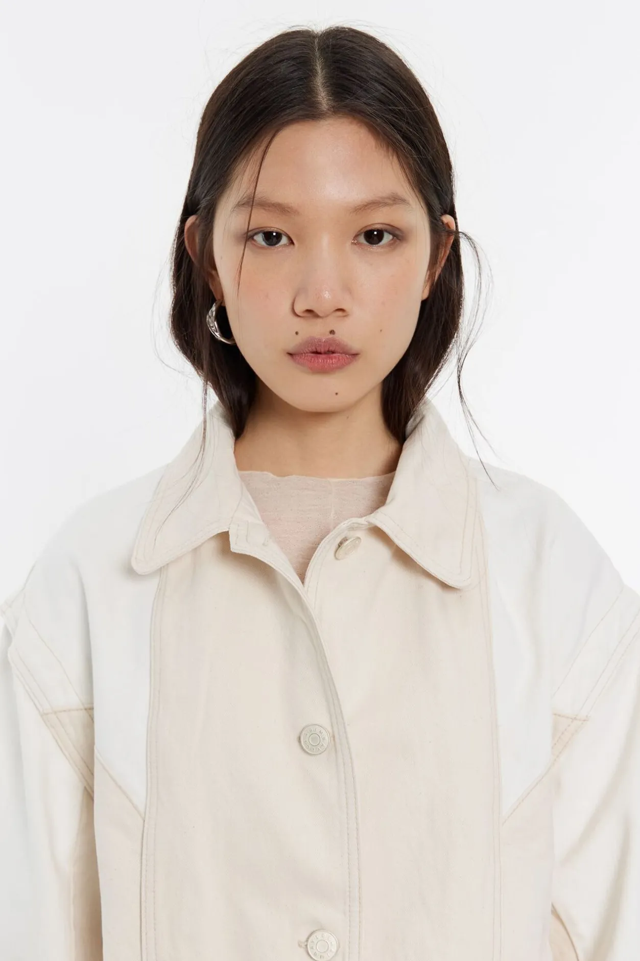 Cazadora Corta Denim Bicolor En Color Crudo. Modelo De Corte Recto, Cuello Camisero, Manga 3/4 Con Sisa Superpuesta Y Cierre Frontal De Botonadura Denim. Bolsillos Saco Redondeados En El Delantero Y Costadillos Pespunteados.