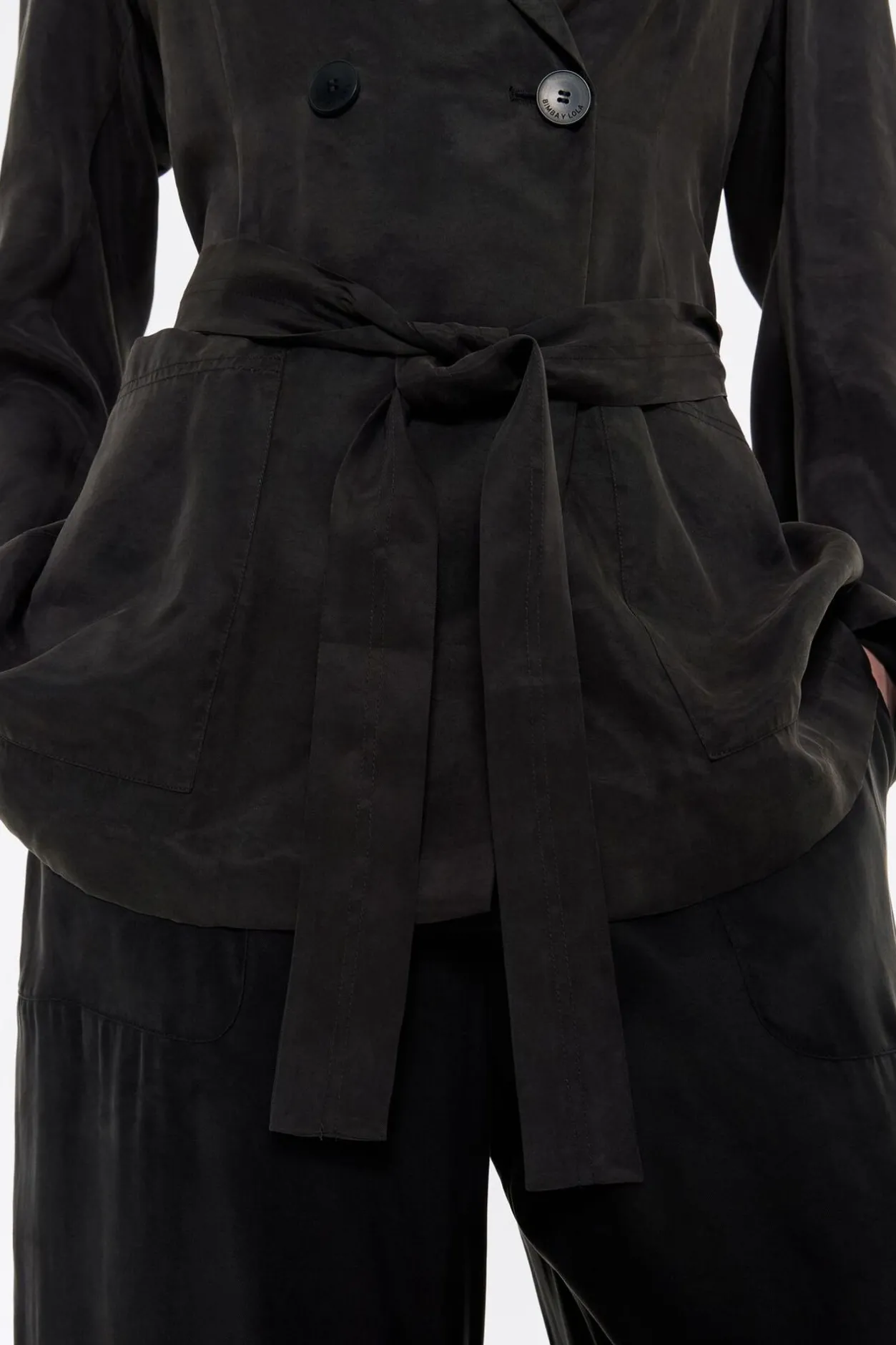 Chaqueta Fluida Cruzada De Lyocell En Color Negro Lavado. Modelo De Corte Recto, Cuello Con Solapas, Manga Larga Y Cierre Frontal De Botonadura. CinturÓN De Tejido, Bolsillos Delanteros De PlastrÓN Y Bolsillos Con Vivo En El Pecho.