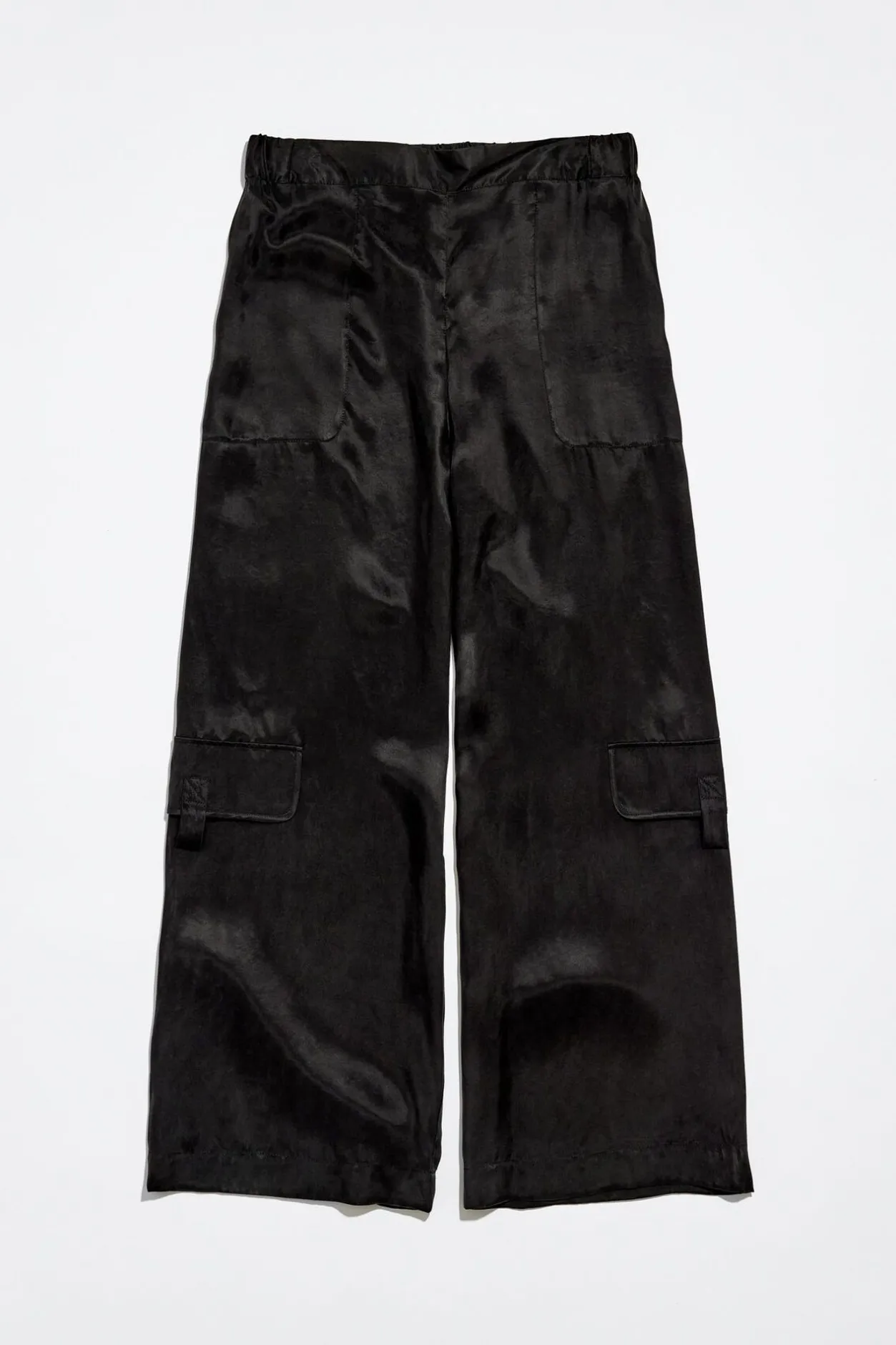 PantalÓN De Tejido De Cupro En Color Negro Lavado. Modelo De Corte Ancho Con Bolsillos Laterales En La Cintura Y Bolsillo En La Pierna Derecha.