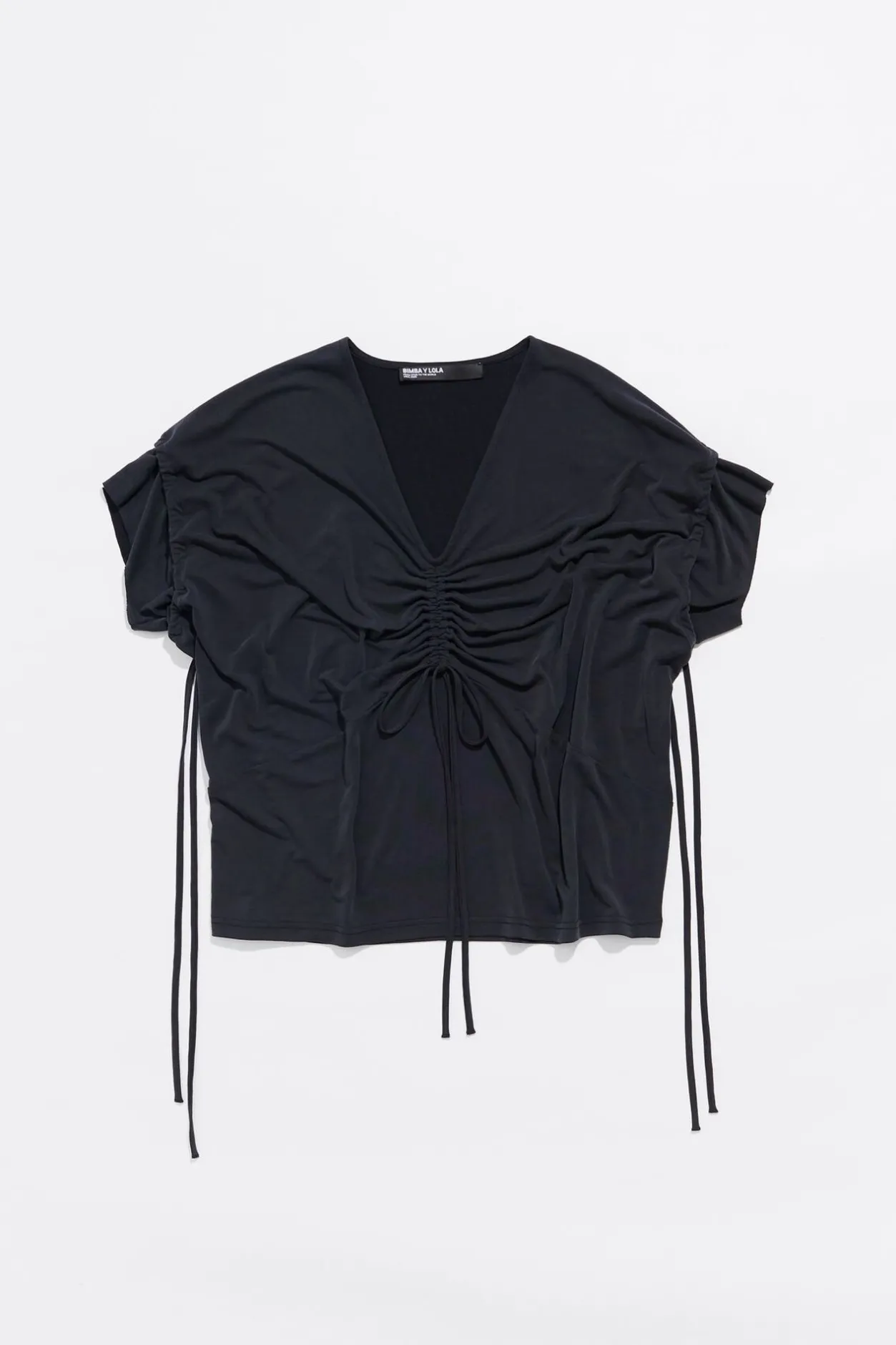 Top En Color Negro Lavado. Modelo De Corte Recto, Escote En V Pronunciado Con Fruncido Y Cordones De Tejido Para Ajustar Y Manga Corta Con Cordones Para Ajustar.