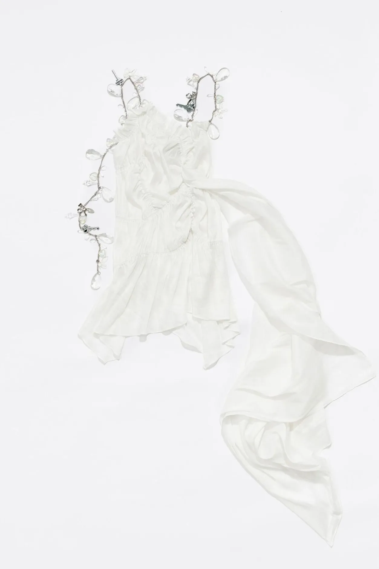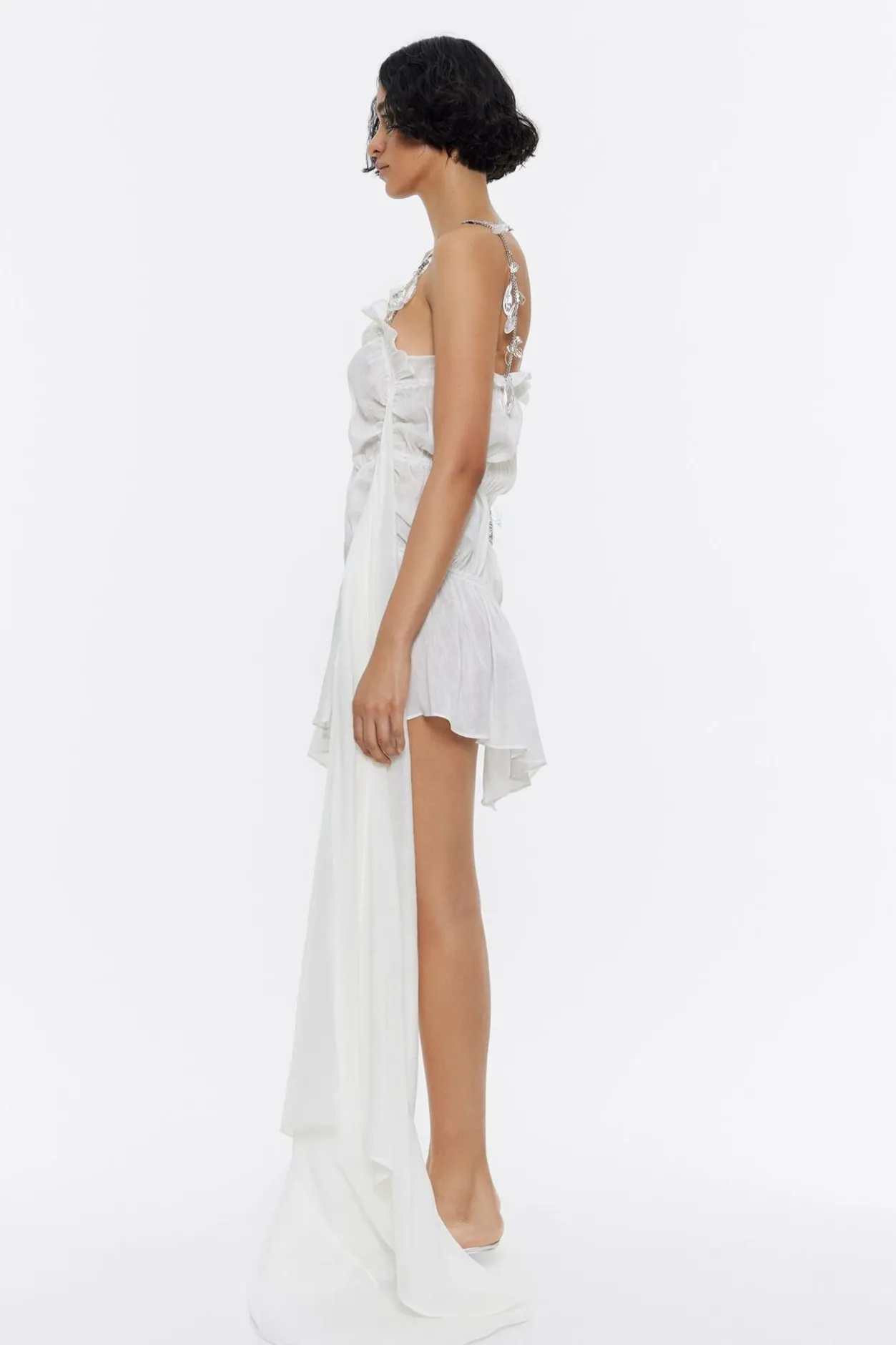 Vestido Fruncido Mini De Lino En Color Marfil. Modelo Con Escote Recto, Tirantes De Cadenas Con Multipiezas Y Maxi PaÑUelo En El Lateral.