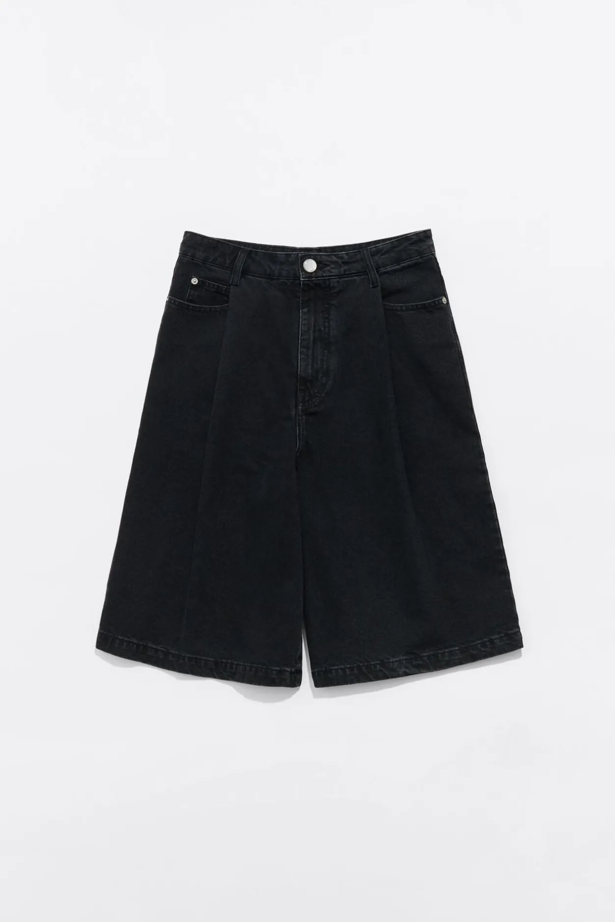 Bermuda Denim En Color Negro Lavado. Modelo De Corte Wide Leg, Tiro Alto, Largo Midi, Cierre Frontal Con BotÓN Denim Y Cinco Bolsillos. Pinzas En El Delantero.