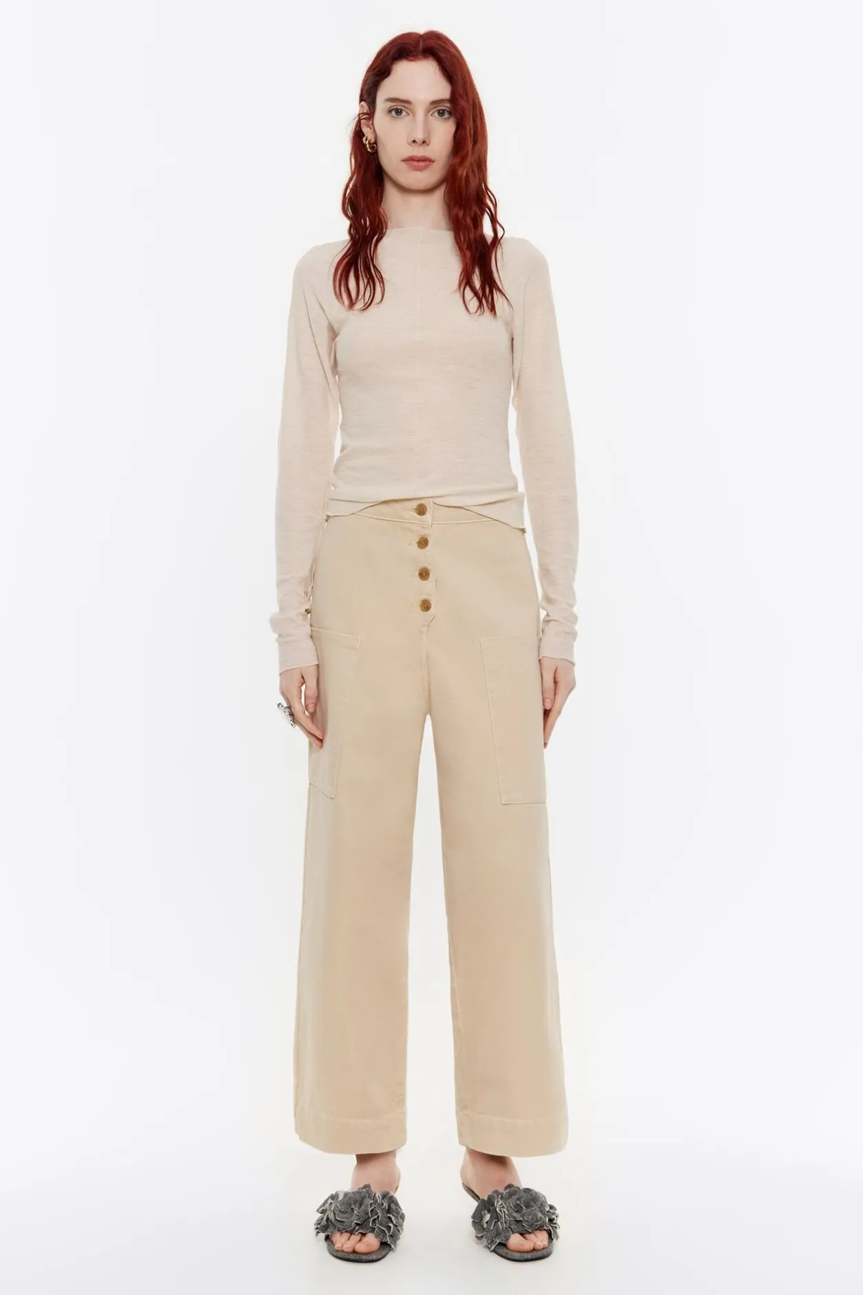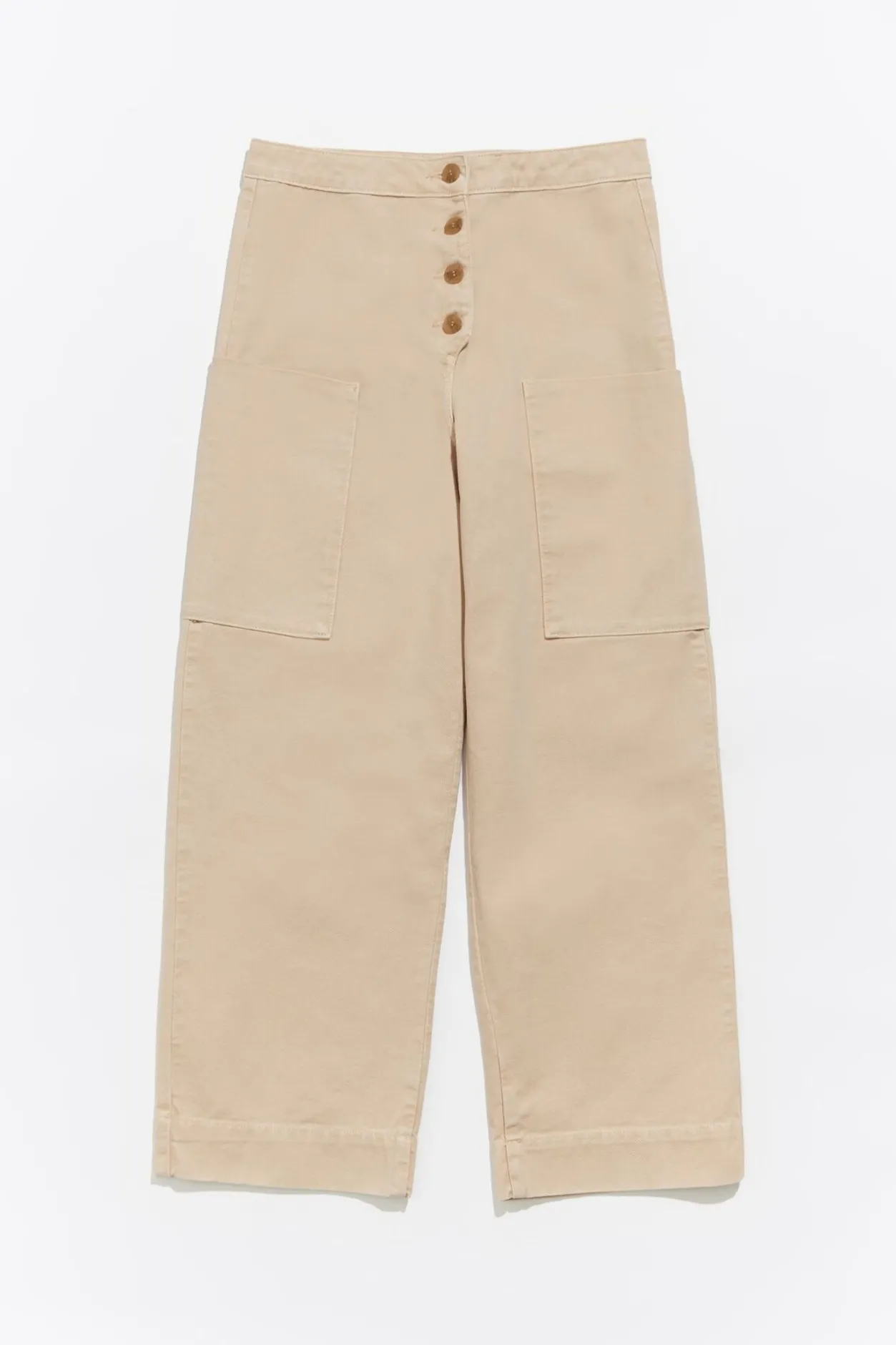 PantalÓN De AlgodÓN En Color Beige. Modelo De Corte Recto, Largo Tobillero, Cierre Frontal De Botonadura Y Bolsillos De PlastrÓN Laterales.