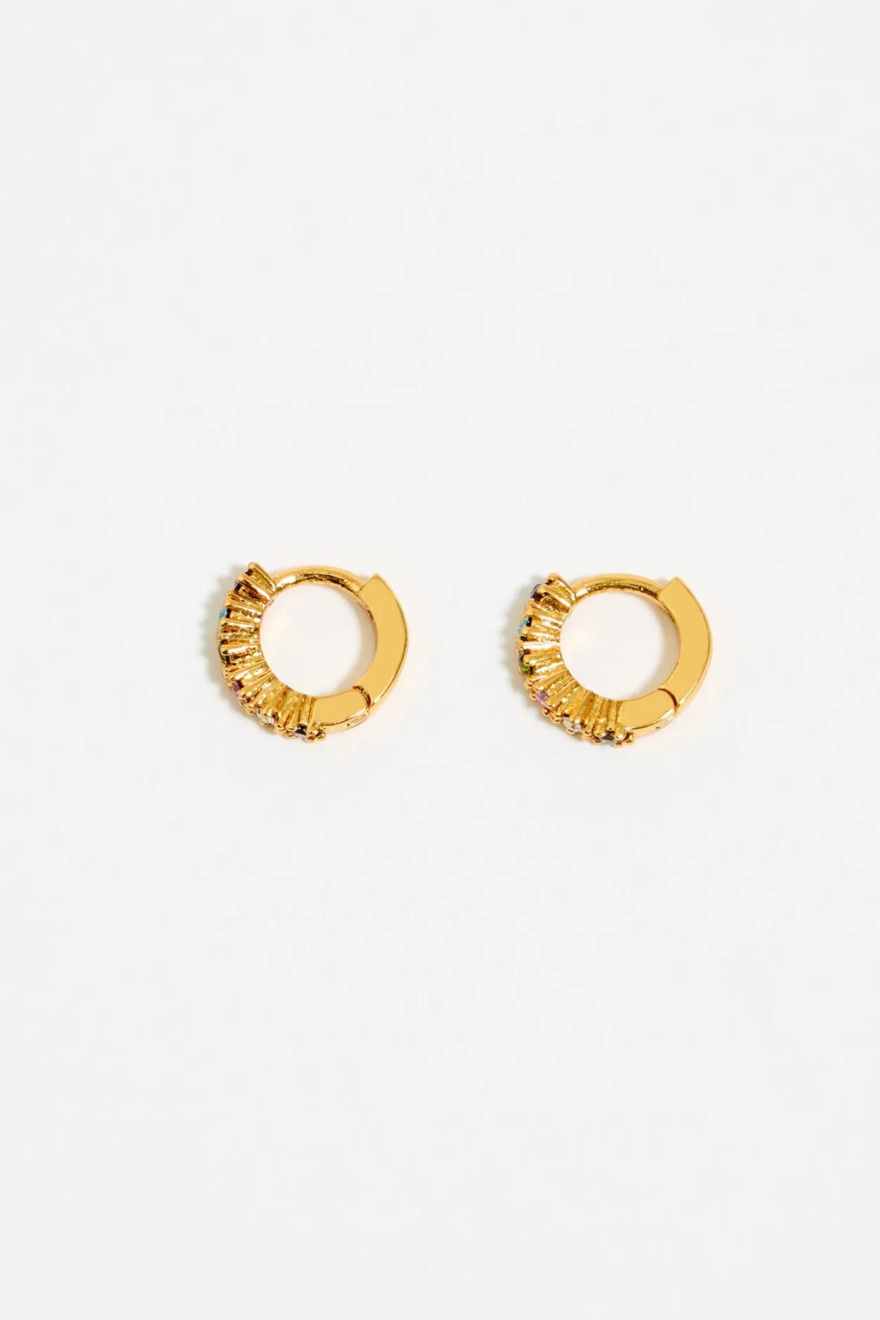 Pendientes De Aro Mini Dorados Con Cristales Engarzados En Color Multipastel Personalizados Con El Logo Grabado. Modelo Con Cierre De Gancho.